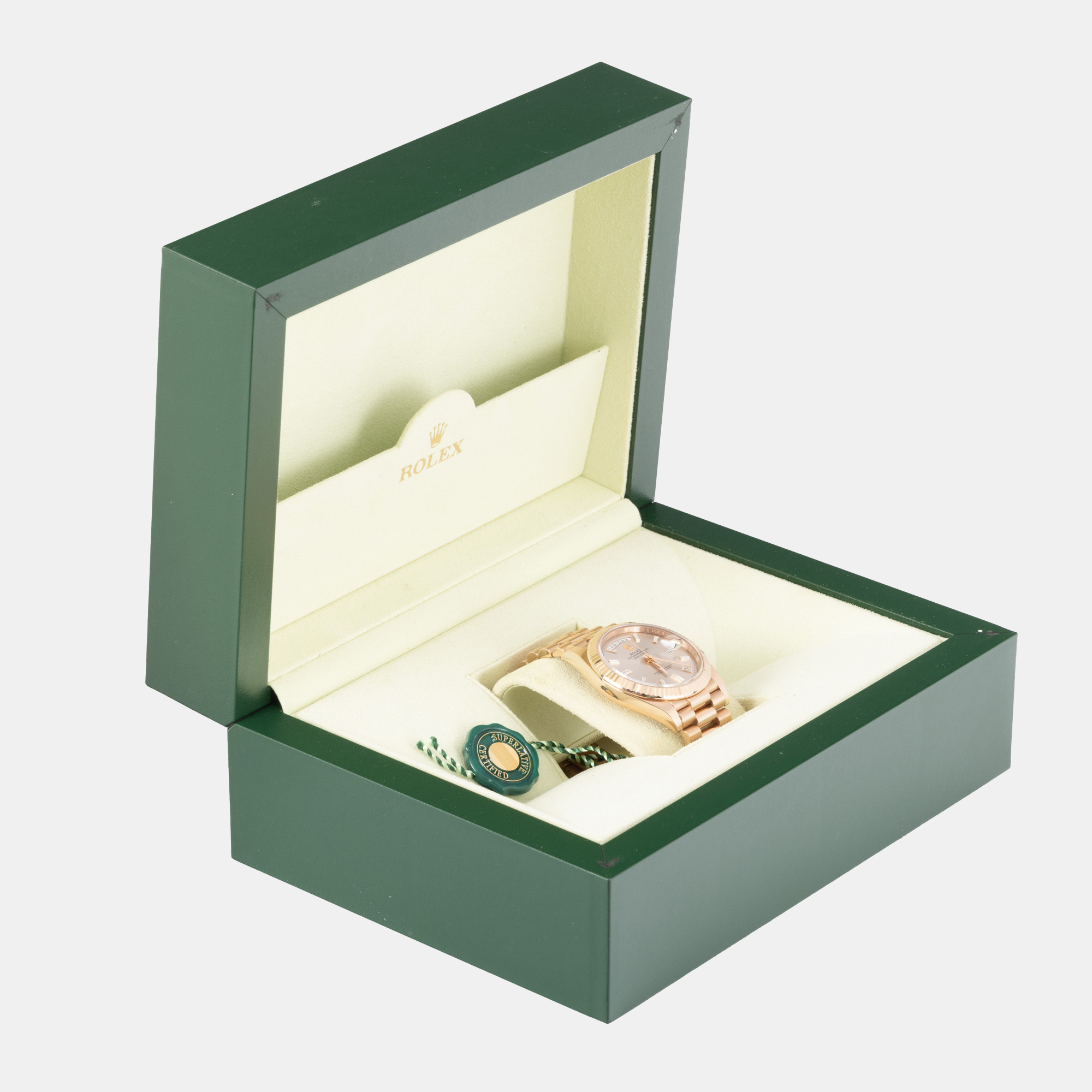7. Ceas Rolex DayDate, din aur roz, cu diamante, în garanție, de mână, bărbătesc, însoțit de cutie originală și broșură [2023]