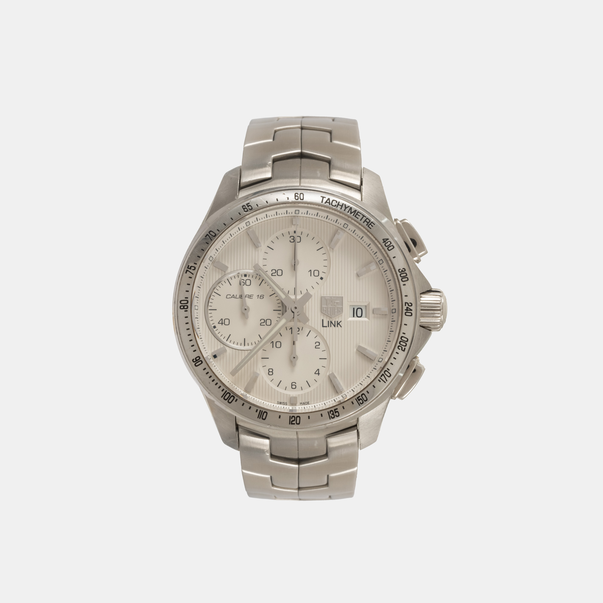 Ceas Tag Heuer Link Chronograph, de mână, bărbătesc, referință CAT2011.BA0952. Mecanism automatic, calibrul 7750, cu funcție de chronograph. Cadran de culoare alb, indici baghetă, cu un registru pentru dată în dreptul orei 3, două registre pentru funcția de chronograph în dreptul orelor 12 și 6 și un registru pentru secundar în dreptul orei 9. Brățară originală, din oțel inoxidabil, cu sistem de închidere de tip deployant.