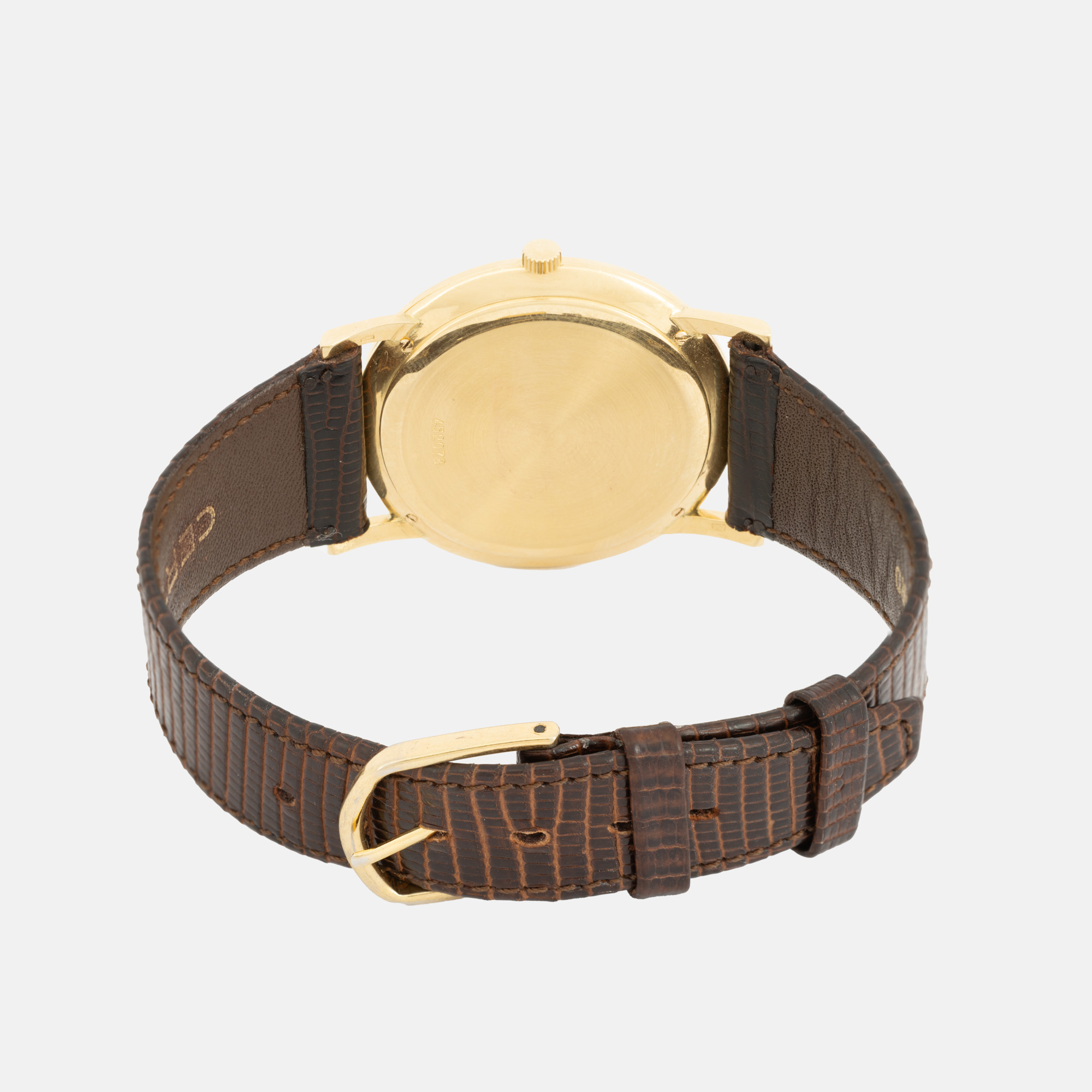 Ceas Vacheron Constantin Patrimony Ultra Slim, din aur, de mână, bărbătesc. Mecanism automatic, calibrul K1120, calibrul de bază JLC 920. Cadran de culoare auriu, indici baghete. Curea adăugată aftermarket, din piele, de culoare maronie, cu sistem de închidere de tip clasic cu cataramă.