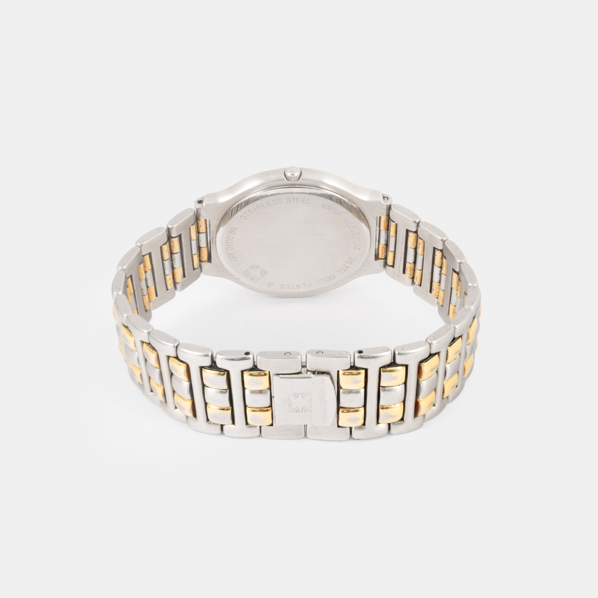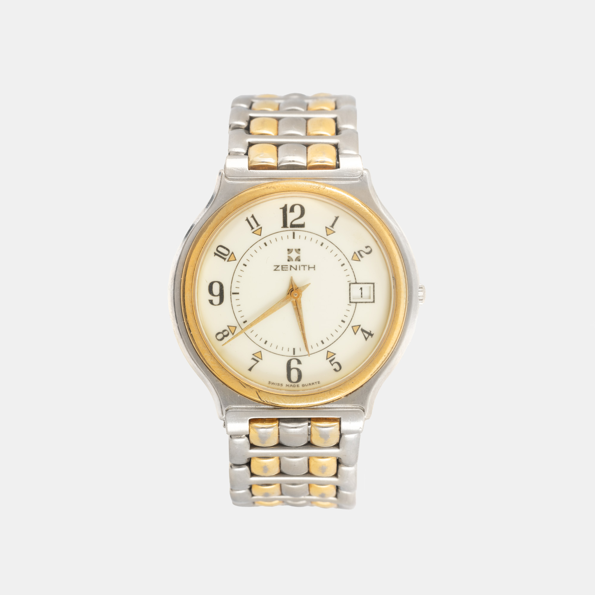 Ceas Zenith Defy, de mână, unisex. Mecanism quartz, cadran de culoare alb, indici cu numerale arabe, cu un registru pentru dată în dreptul orei 3. Brățară originală, din oțel inoxidabil, cu sistem de închidere de tip deployant.