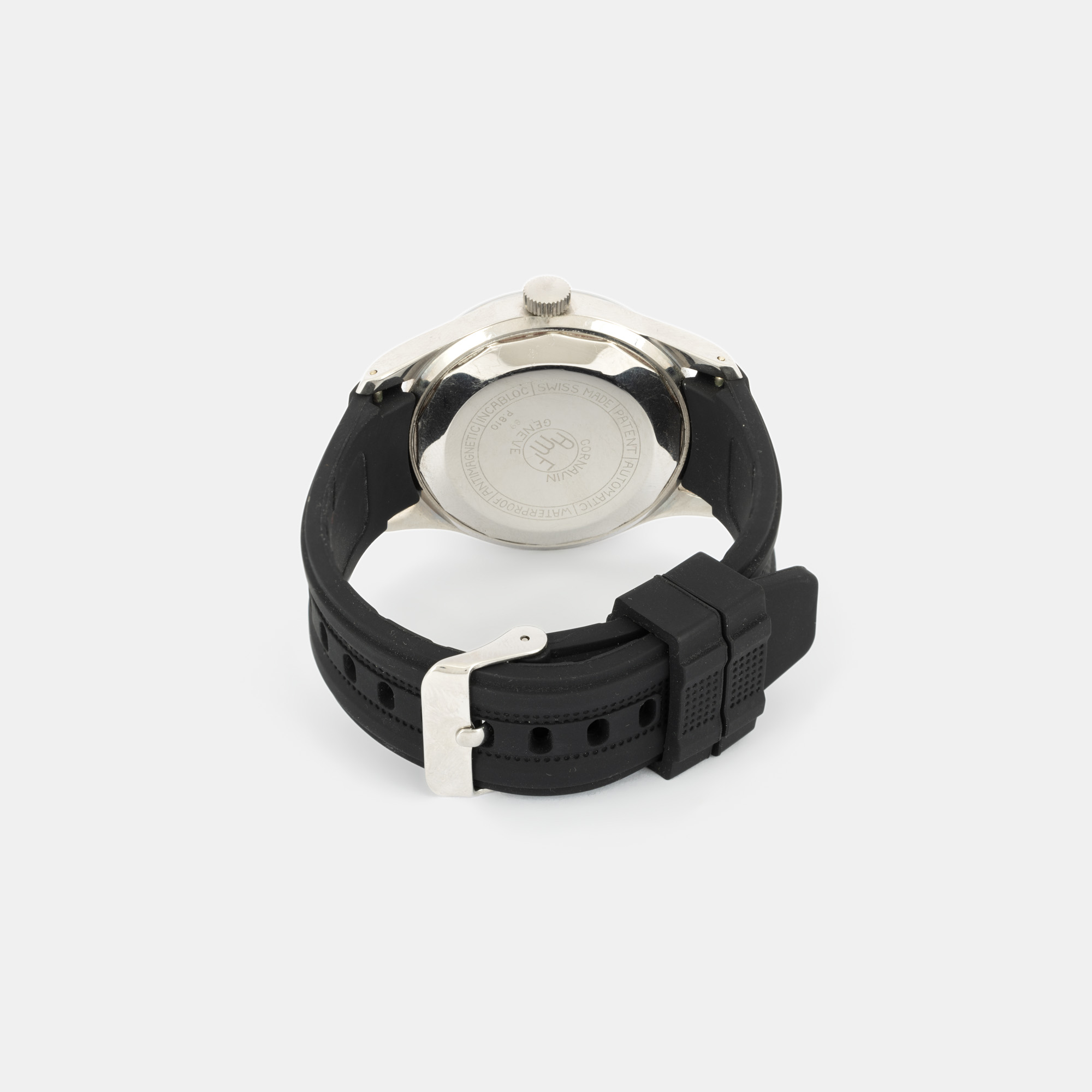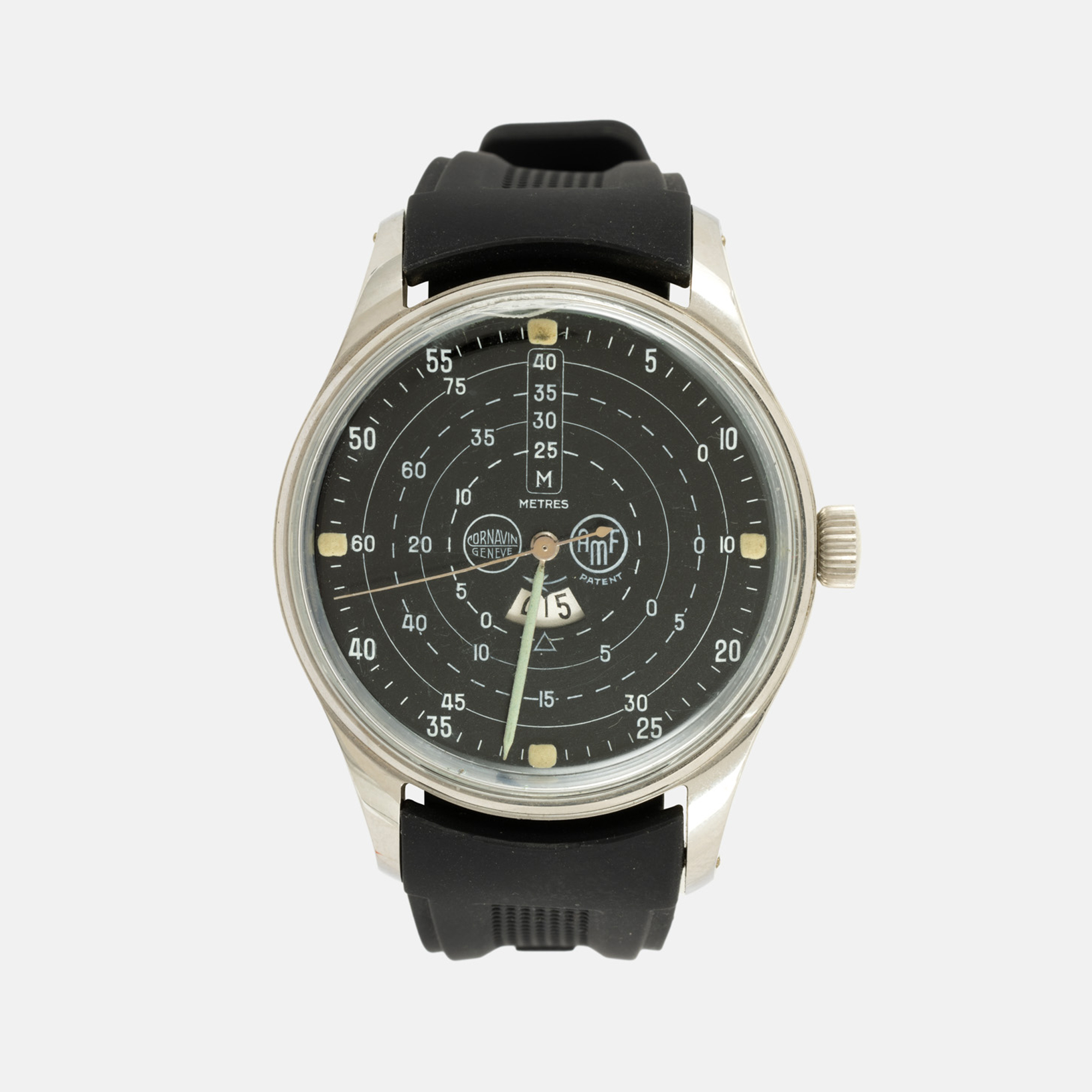 Ceas Cornavin P 810 Diver, de mână, bărbătesc. Mecanism cu armare manuală. Cadran de culoare negru, indici numerale arabe, cu gradații pentru perioadele de decompresie la ieșirea la suprafață a scafandrilor, ora afișată într-un registru central. Curea adăugată aftermarket, din cauciuc, de culoare neagră, cu sistem de prindere de tip clasic cu cataramă.