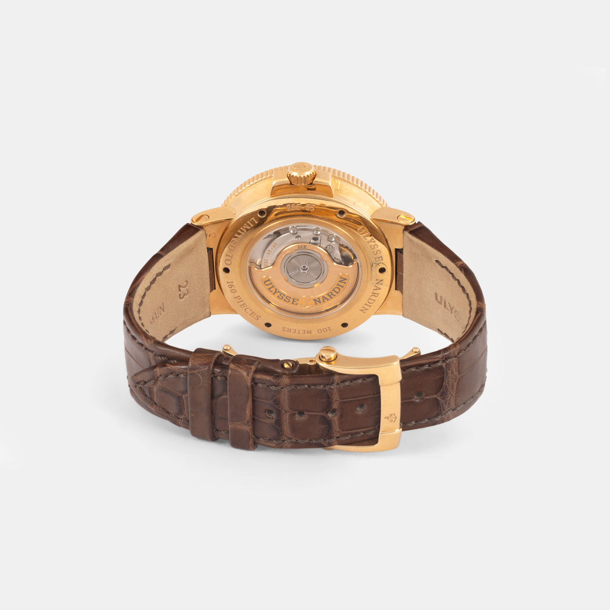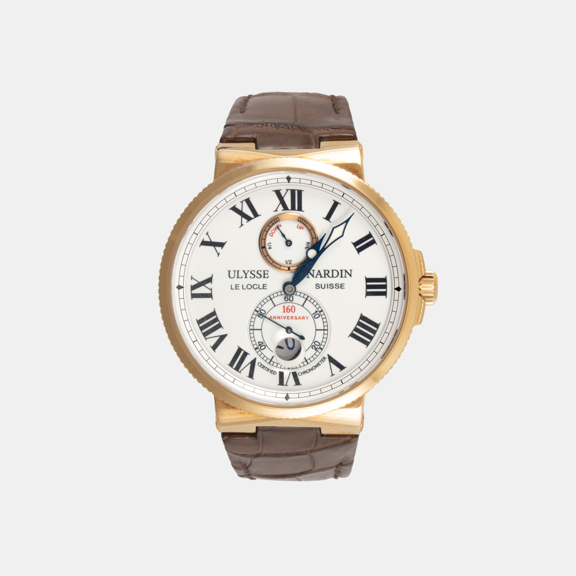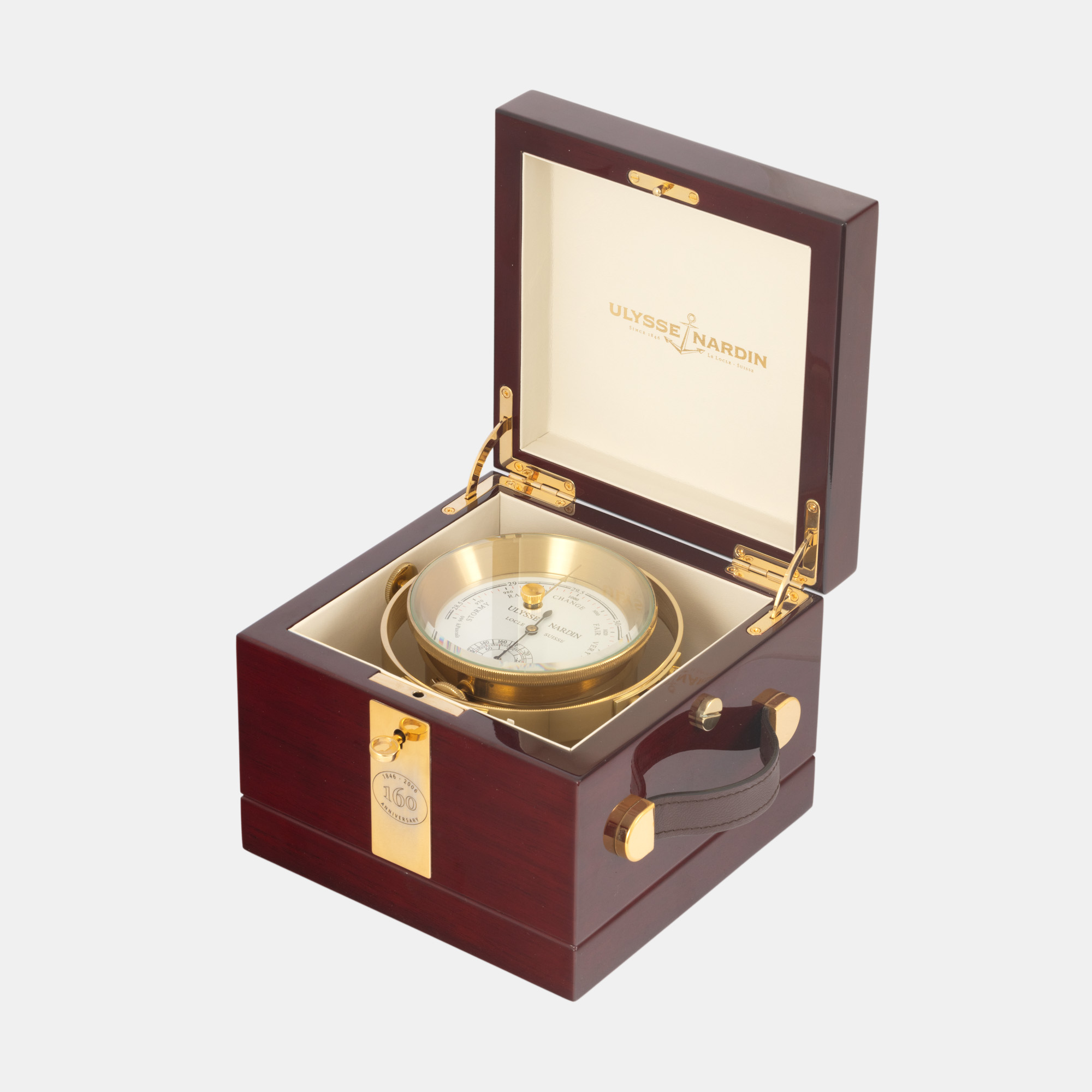 Pachet aniversar Ulysse Nardin compus din ceas Maxi Marine Chronometre din aur și barometru, ediție limitată No.123/160. Ceas: referință 266-65. Mecanism automatic, calibrul UN-26, anterior vitrat. Cadran din email alb, indici cifre romane, registru dublu pentru secundar și dată în dreptul orei 6, registru pentru rezerva de putere în dreptul orei 12. Curea originală, din piele, de culoare maronie, cu sistem de închidere de tip deployant. Barometru: cadran de culoare alb, indici numerale arabe, registru pentru termometru în partea inferioară a cadranului. Accesorii: cutia originală, carte de certificare a chronometrului, card de garanție, manual de instrucțiuni și broșură.