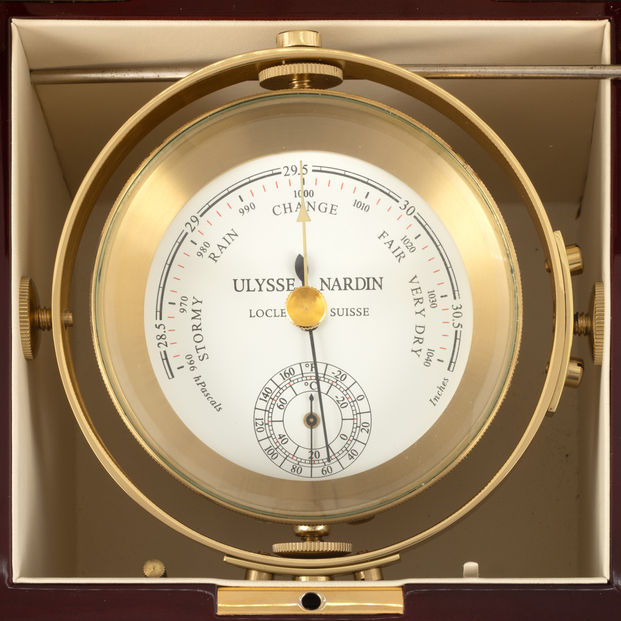 8. Pachet aniversar Ulysse Nardin compus din ceas Maxi Marine Chronometre din aur și barometru, ediție limitată No. 123/160, însoțite de cutia originală, carte de certificare a chronometrului, card de garanție, manual de instrucțiuni și broșură [2006]