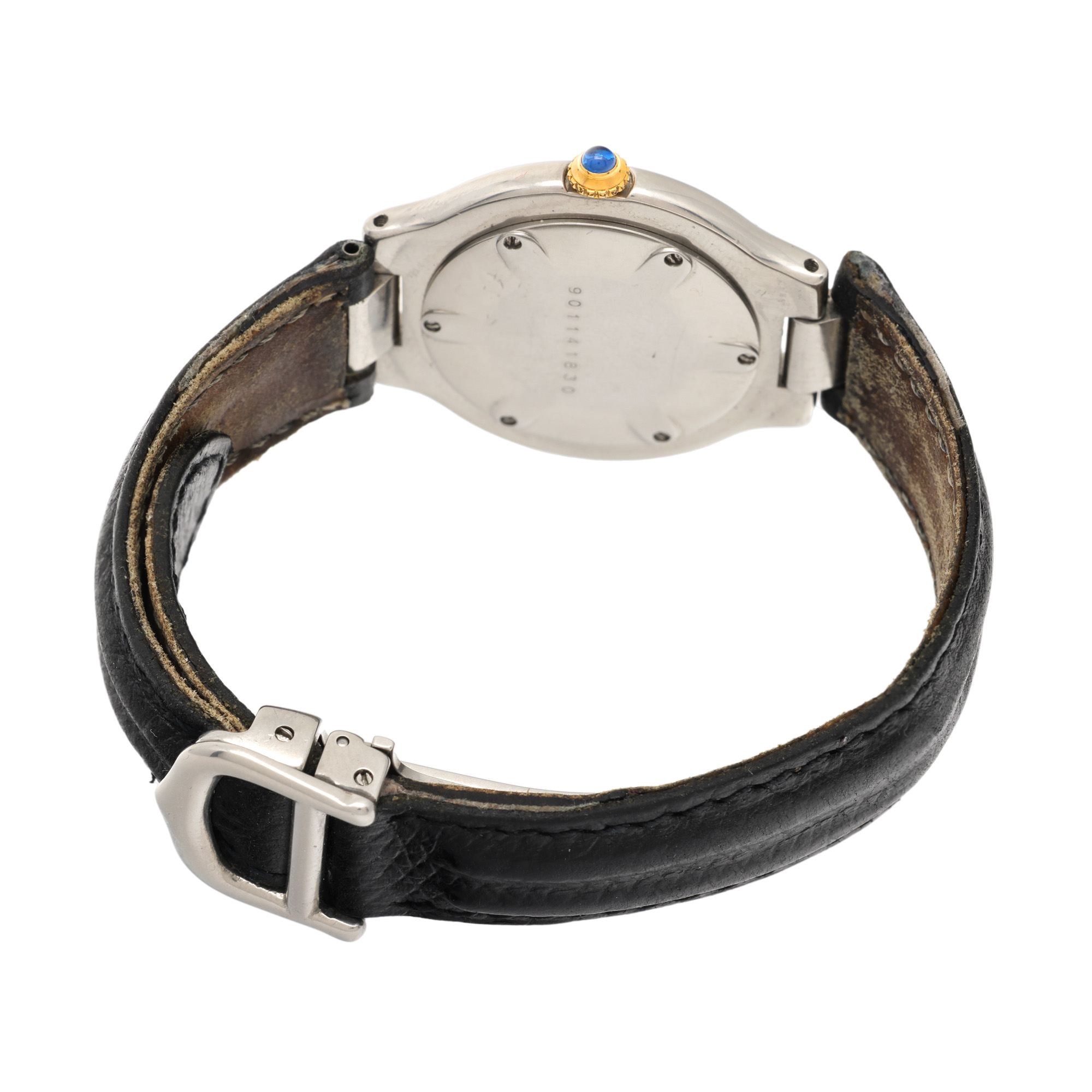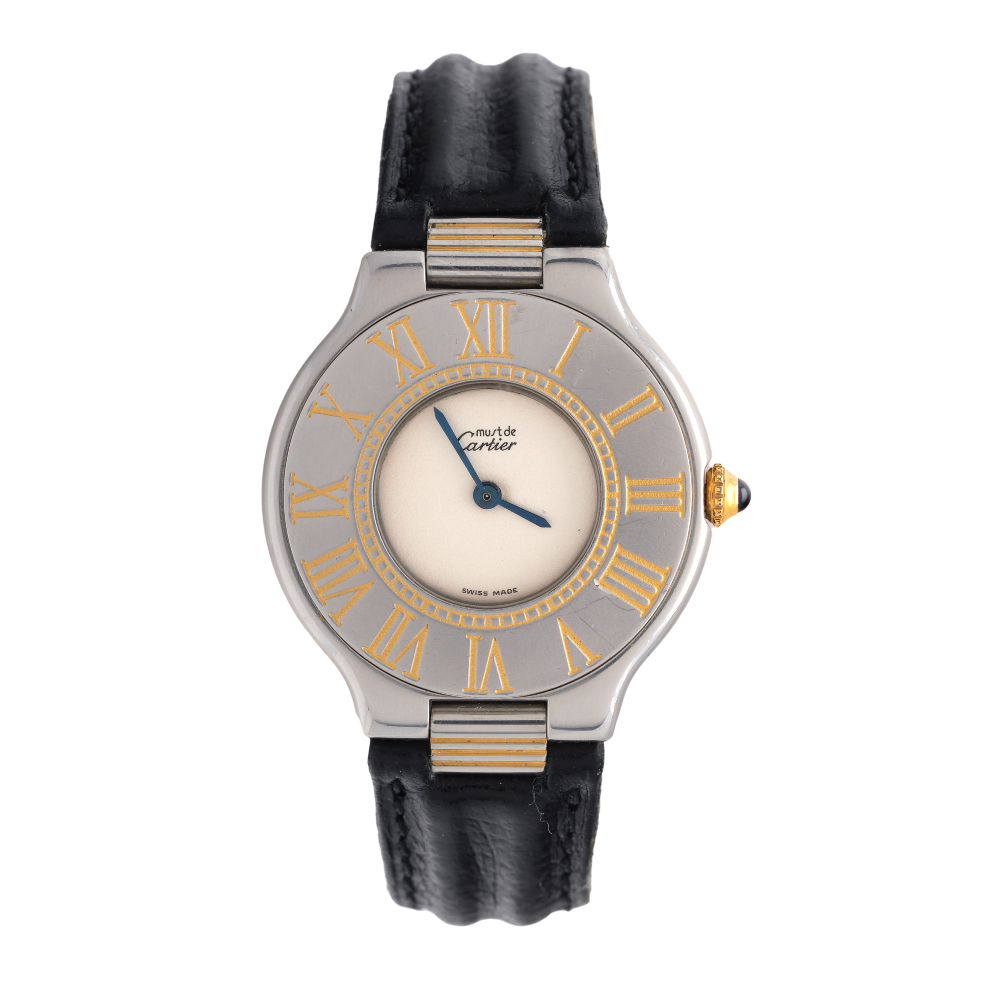 Ceas Cartier Must de Cartier, de mână, de damă. Mecanism quartz. Cadran de culoare alb, indici numerale romane dispuși pe carcasă. Curea originală, din piele, de culoare neagră, cu sistem de închidere de tip deployant.