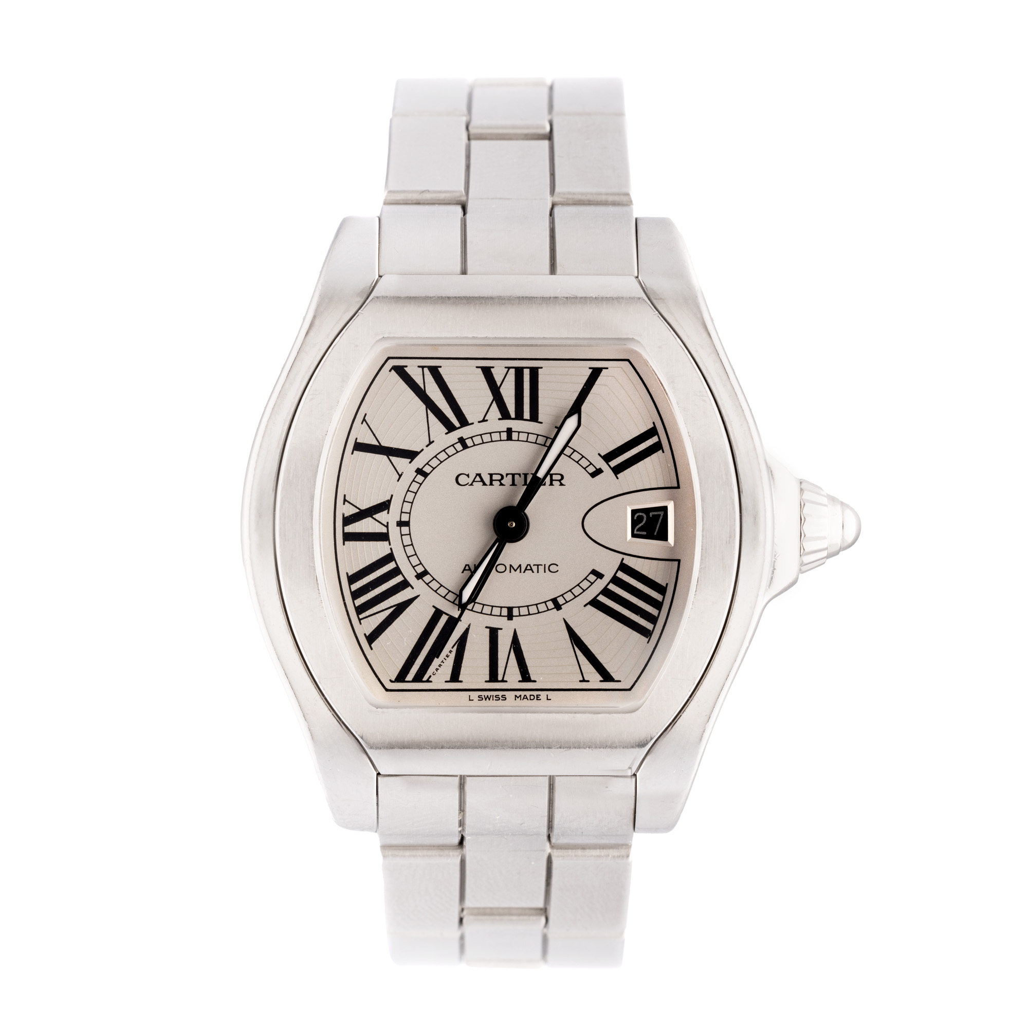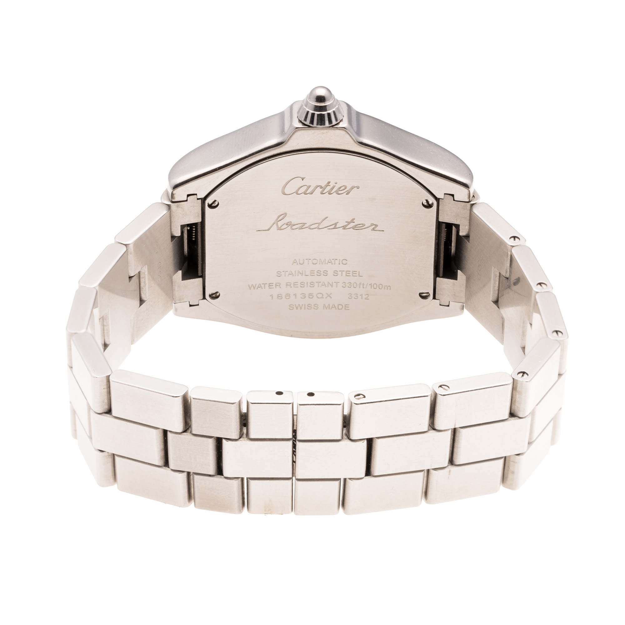 Ceas Cartier Roadster, de mână, bărbătesc, referința 3312. Mecanism automatic. Cadran de culoare alb, indici numerale romane, registru pentru dată în dreptul orei 3. Brățară originală, din oțel, cu sistem de închidere de tip deployant.