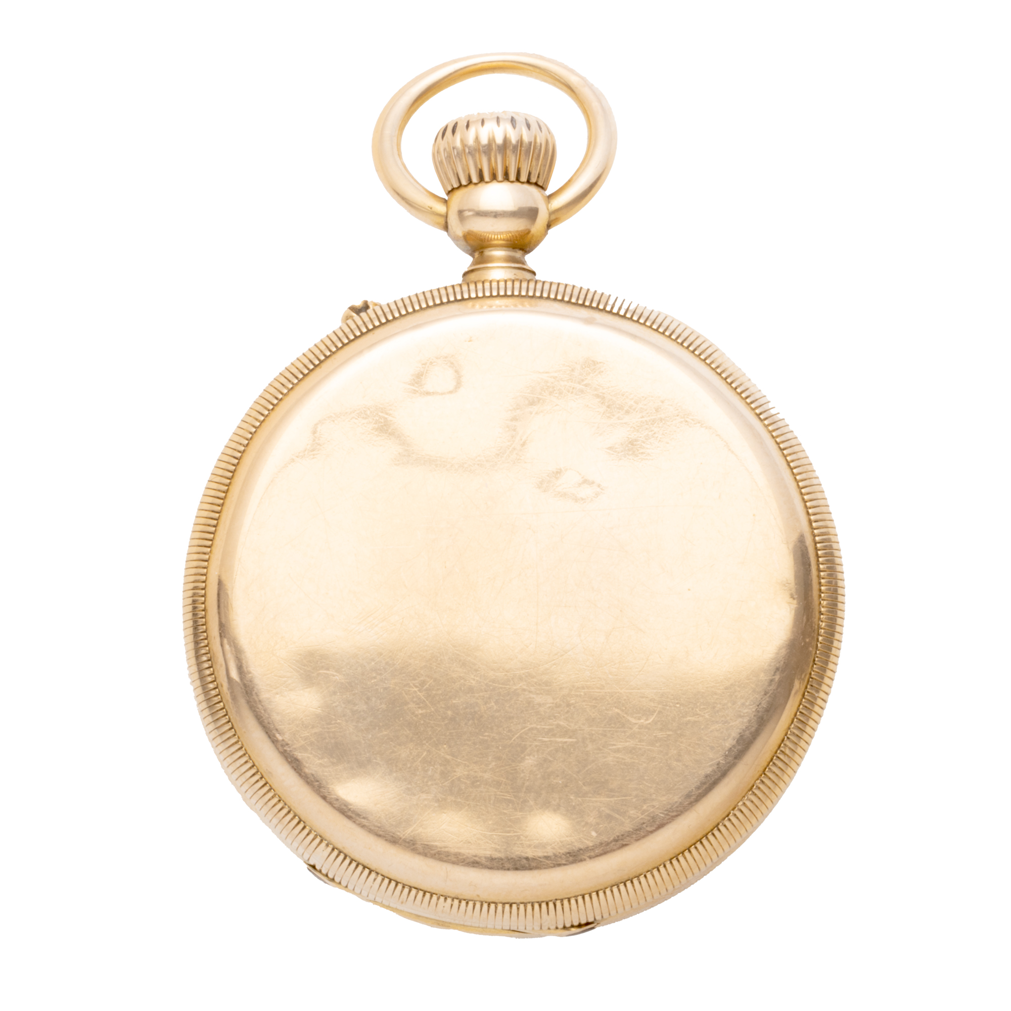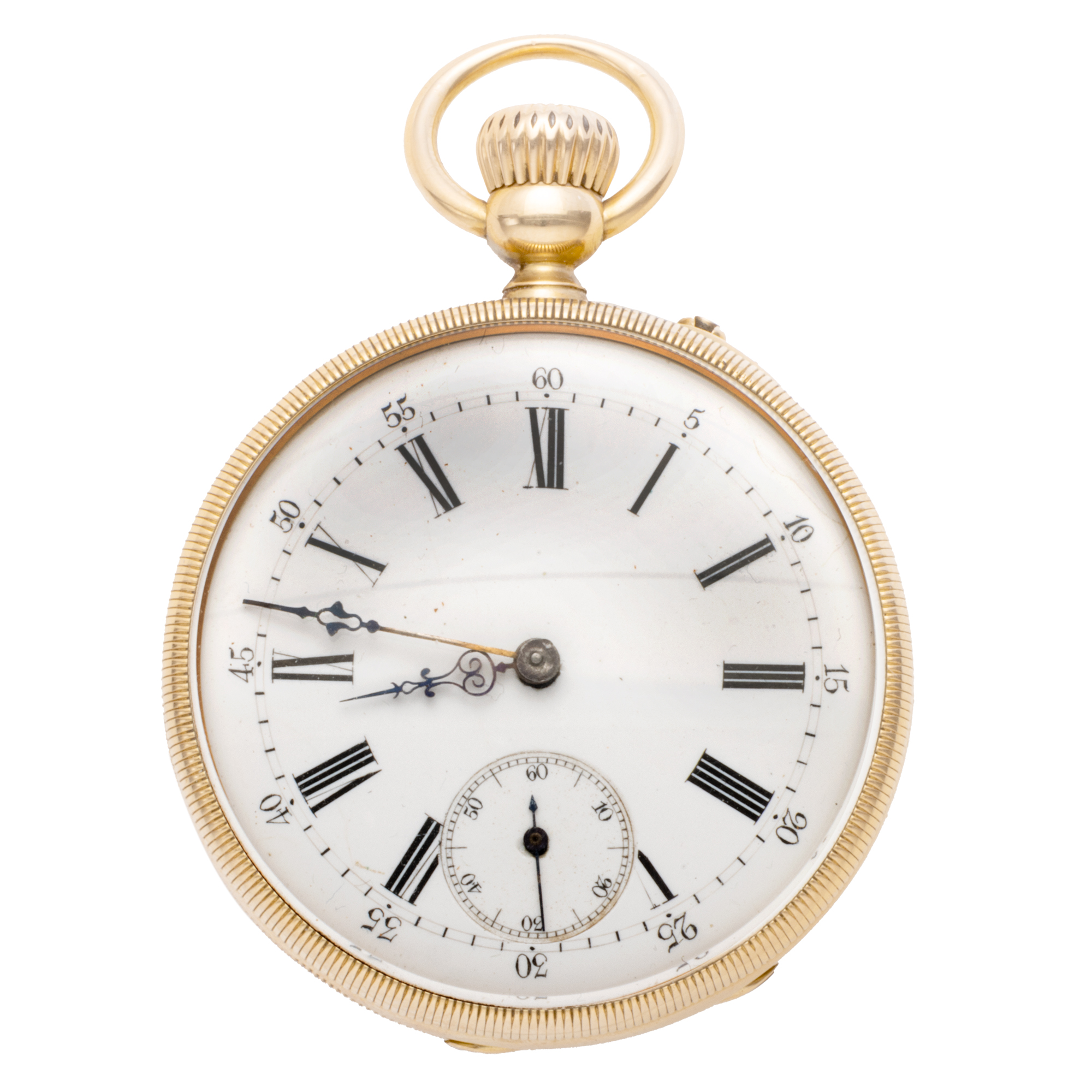 Ceas din aur, de buzunar, unisex. Mecanism cu armare manuală. Cadran de culoare alb, indici numerale romane, registru pentru secundar în dreptul orei 6.