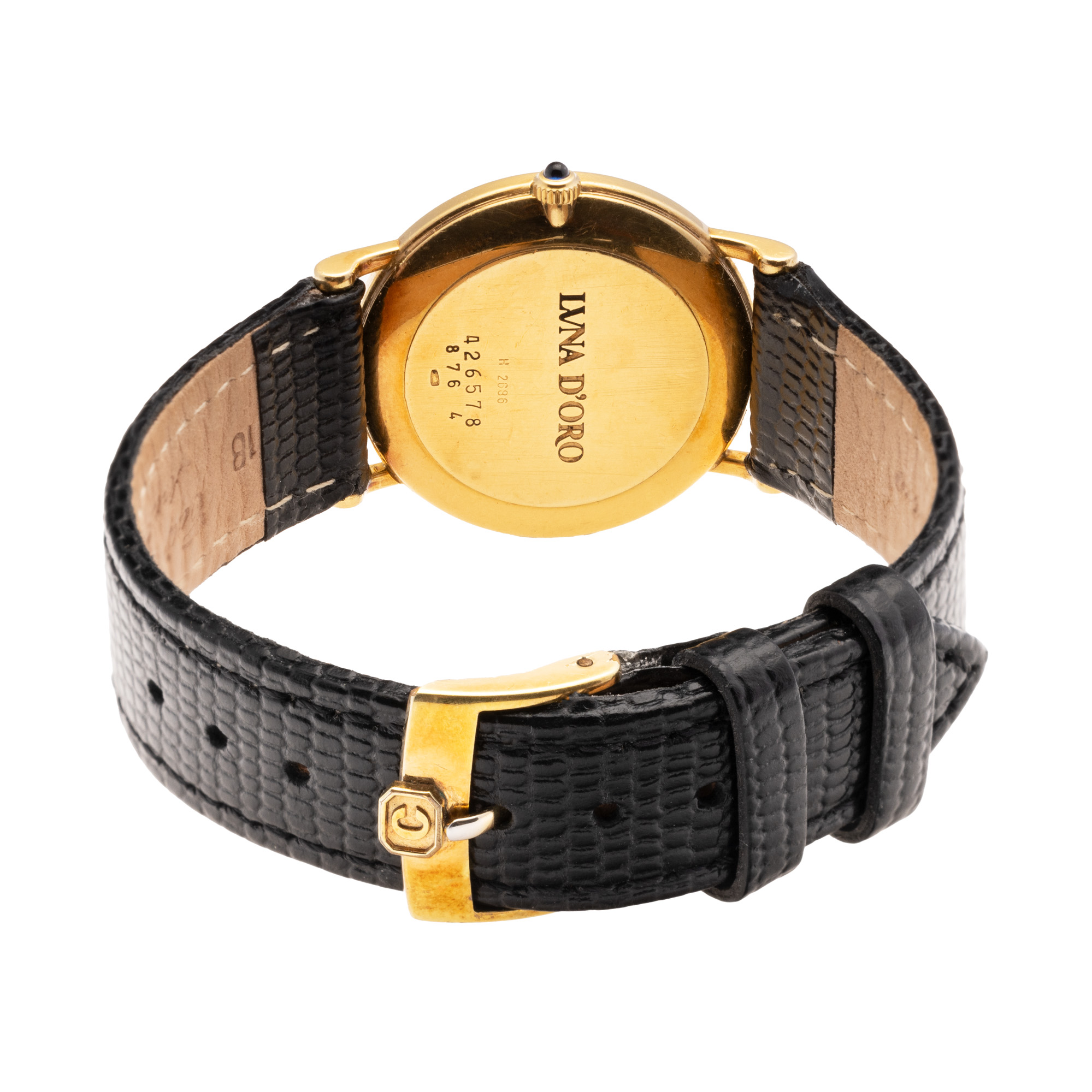 Ceas Chopard Luna D´Oro din aur, de mână, de damă, referință: H2686. Mecanism quartz. Cadran de culoare alb, indici numerale romane, registru destinat fazelor lunii în dreptul orei 6. Curea adăugată aftermarket, din piele, de culoare neagră, cu sistem de închidere de tip clasic cu cataramă originală, placată cu aur.