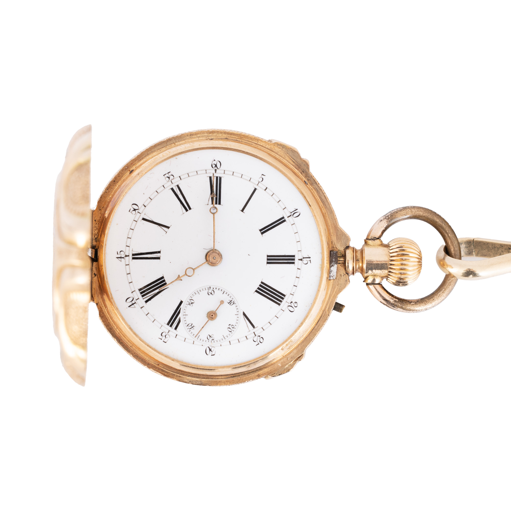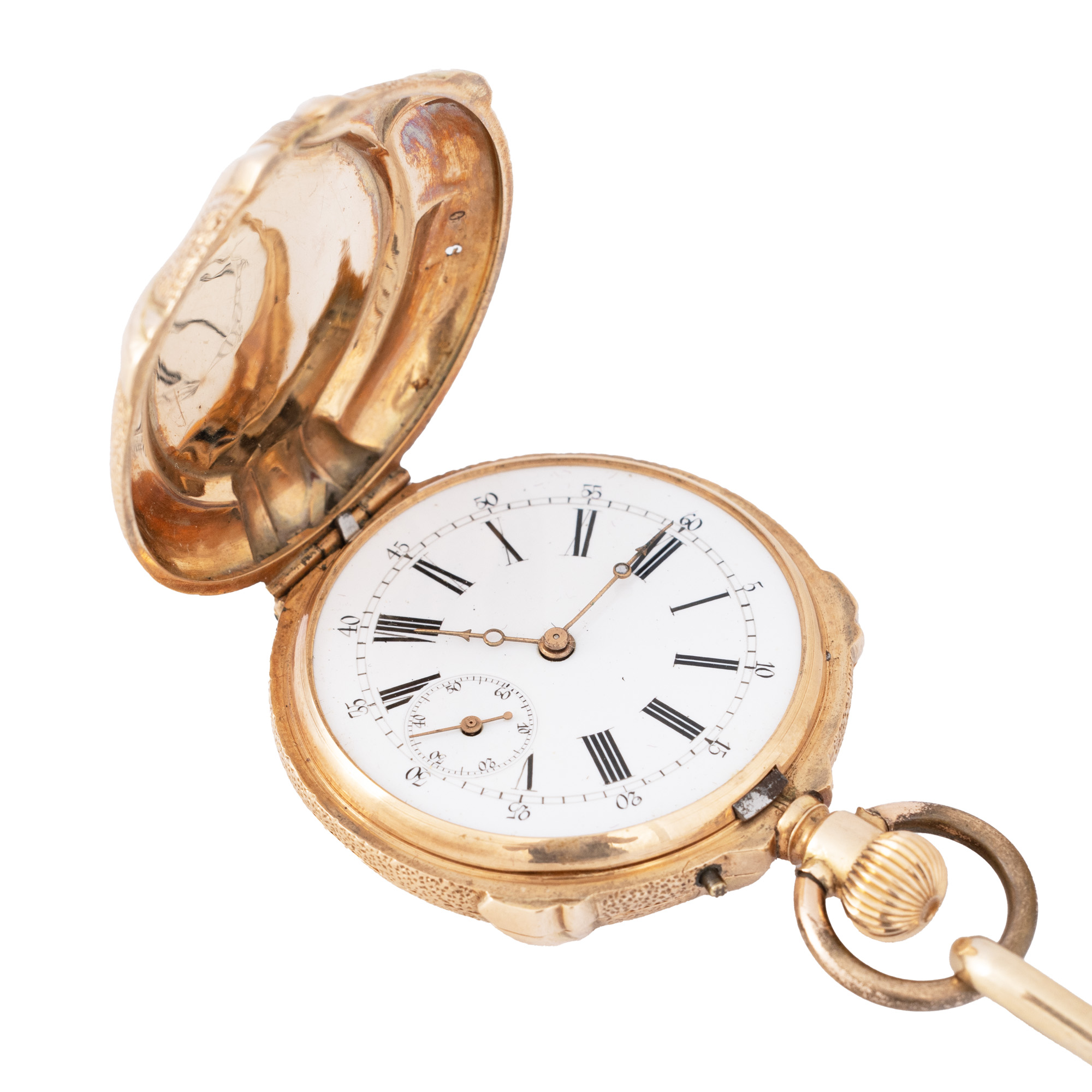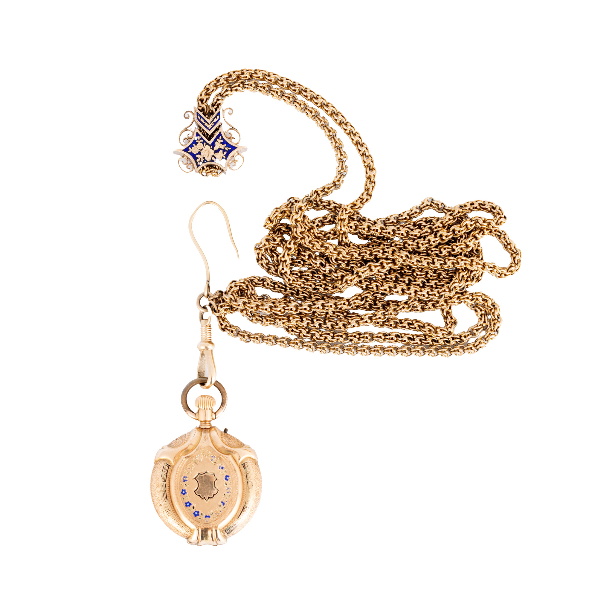 Ceas de buzunar, din aur, de damă, decorat cu email. Mecanism cu armare manuală, cadran de culoare alb porțelanat, indici cu numerale romane, cu un registru pentru secundar în dreptul orei 6. Accesorii: lanț din aur. Observații: ceasul nu prezintă geam, necesită revizie.