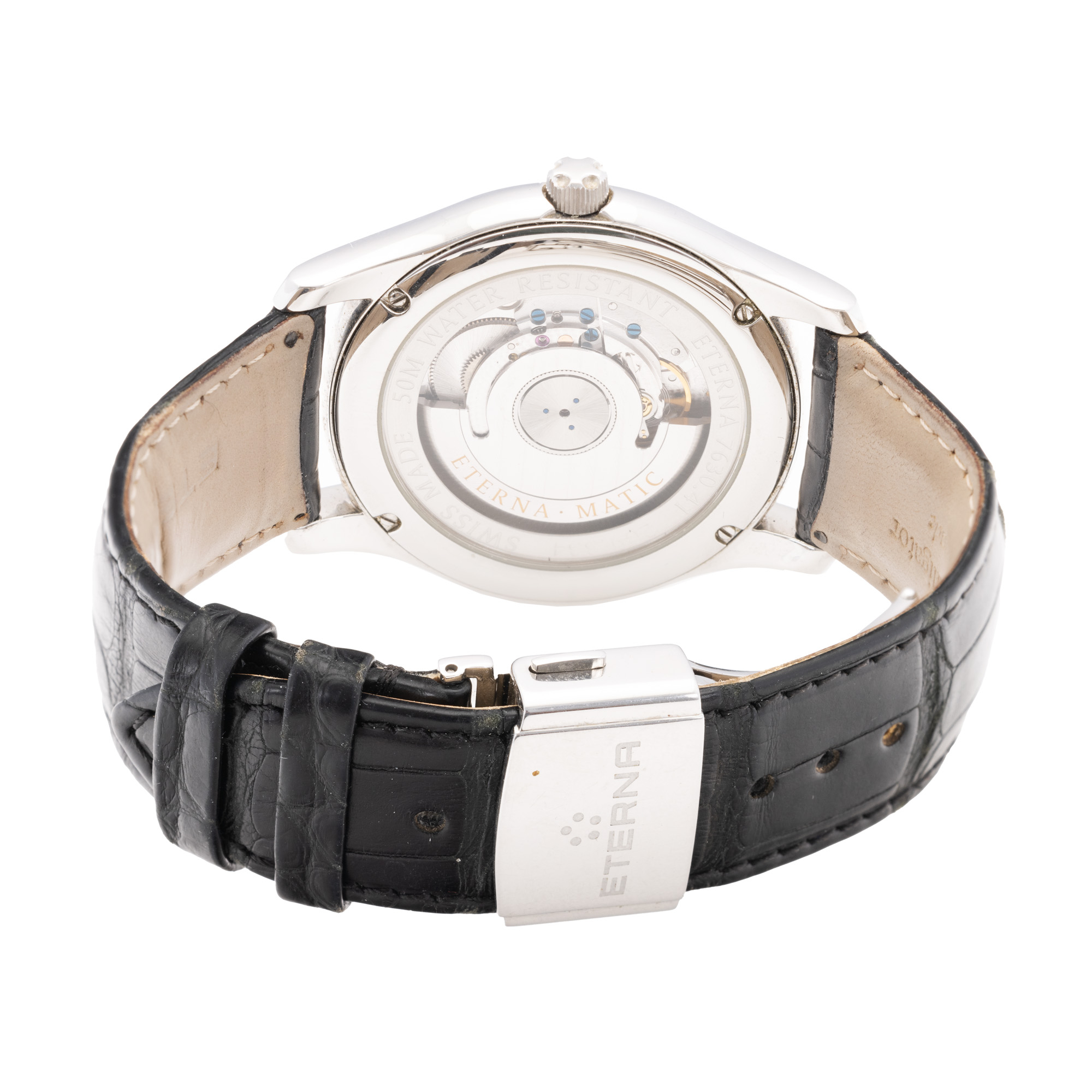 Ceas Eterna Vaughan Big Date, de mână, bărbătesc, referință 7630.41. Mecanism automatic, calibrul Eterna 3030, anterior vitrat. Cadran de culoare argintiu, indici baghetă, registru pentru dată în dreptul orei 3. Curea originală, din piele, de culoare neagră, cu sistem de închidere de tip deployant. Accesorii: cutia originală.