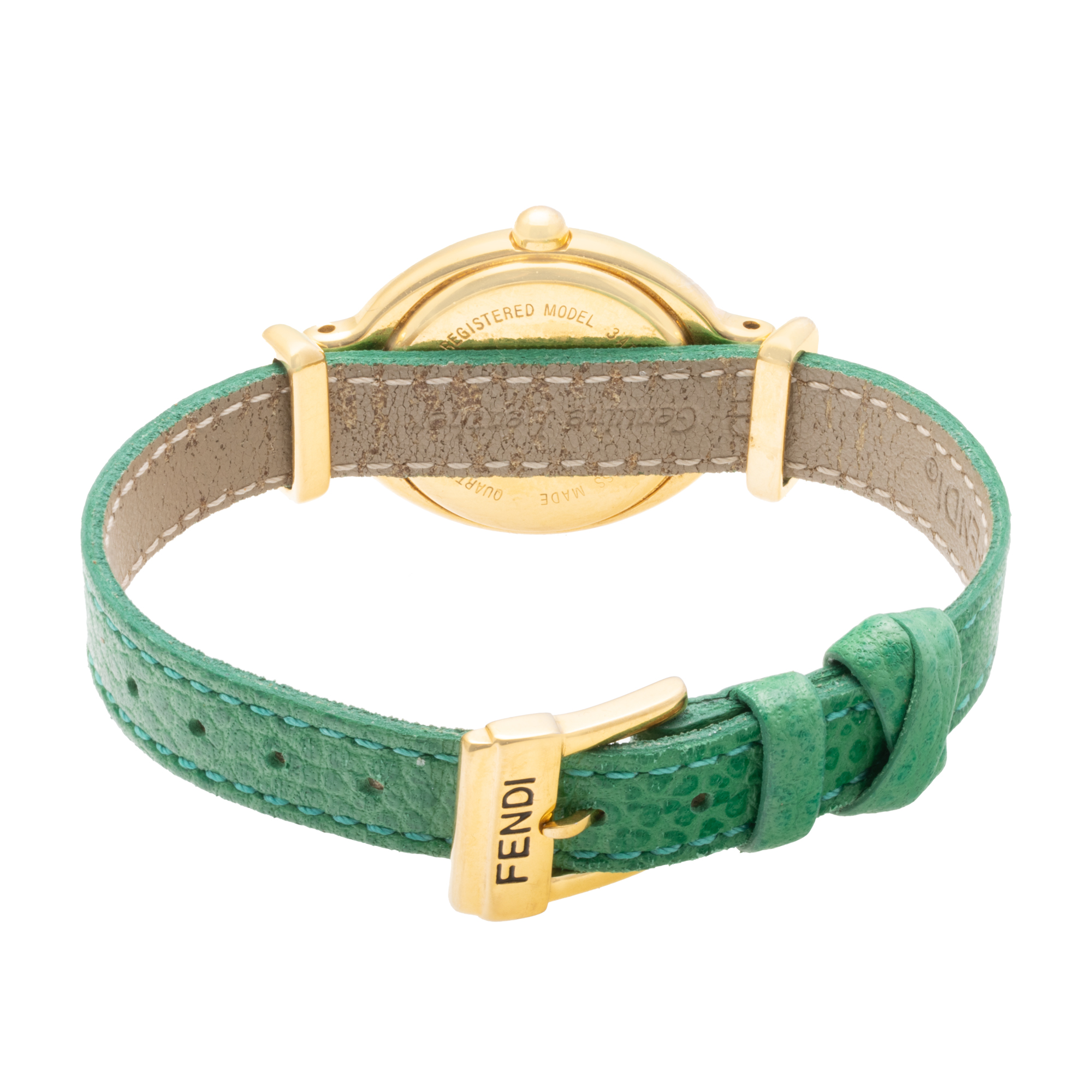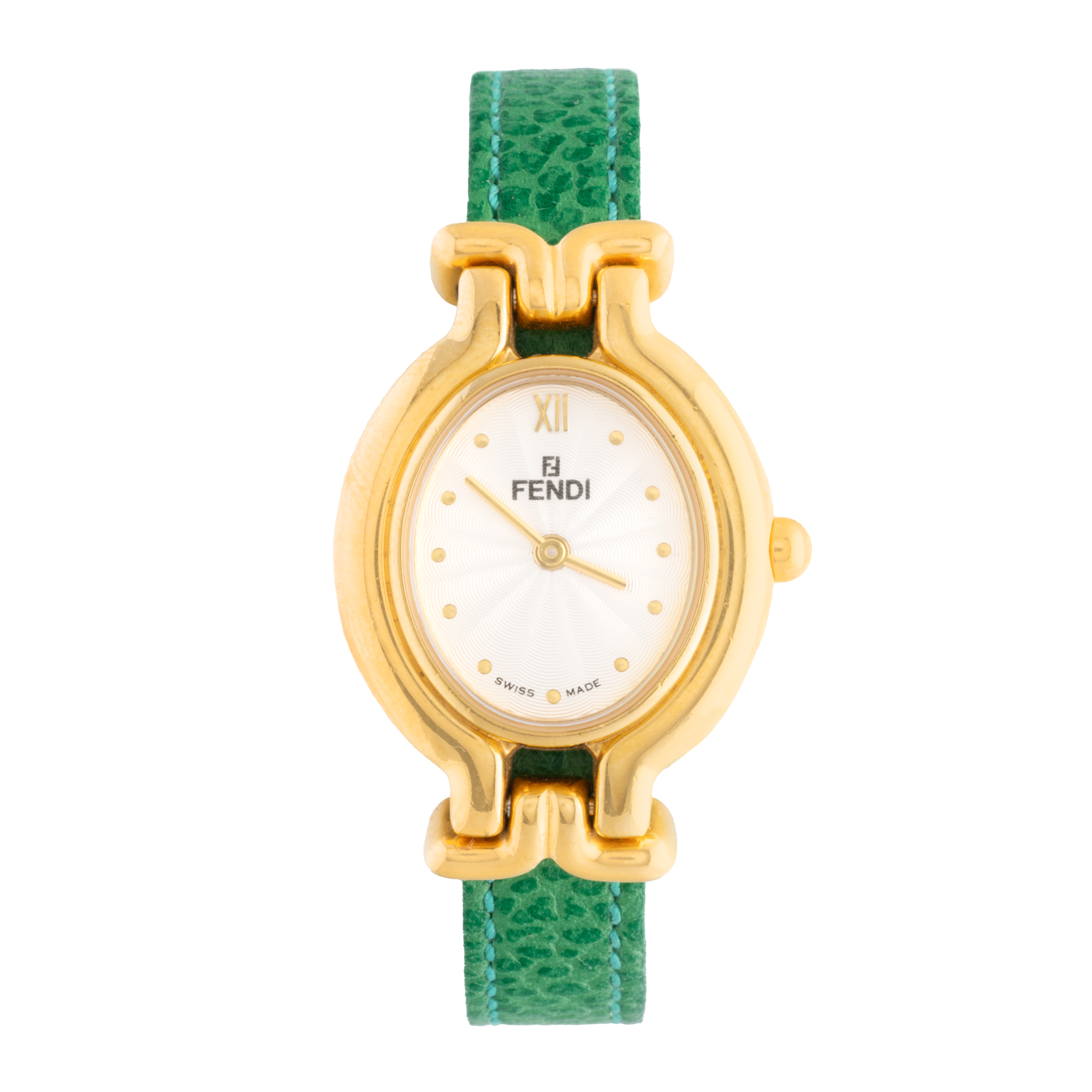 Ceas Fendi, de mână, de damă. Mecanism quartz. Cadran de culoare argintiu, indici punctați. Curea originală, din piele, de culoare verde, cu sistem de închidere de tip clasic cu cataramă.