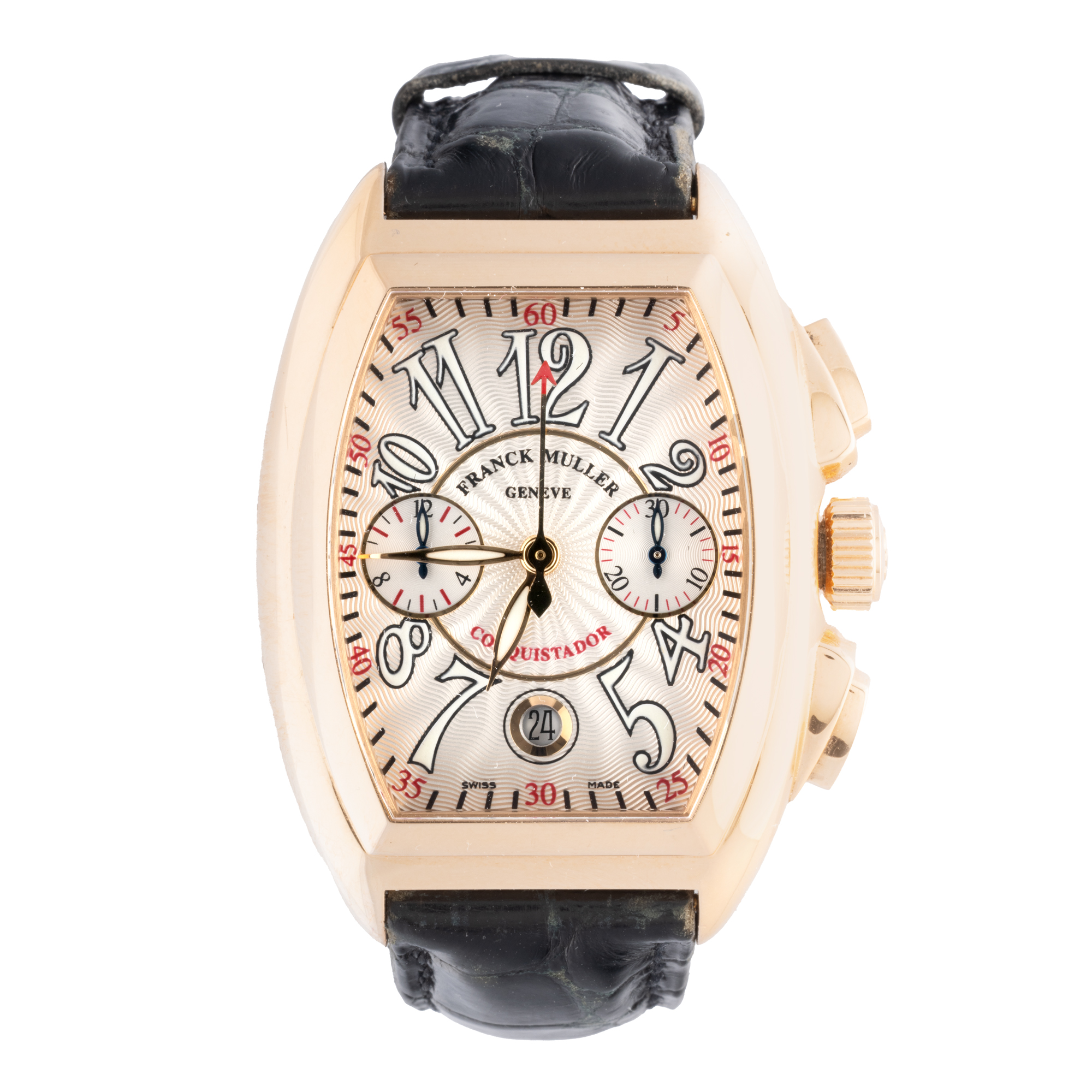 Ceas Franck Muller Conquistador Chronograph, din aur, de mână, bărbătesc, referință 8005 CC. Mecanism automatic, calibrul 7002. Cadran de culoare ivory, decorat în relief, indici cu numerale arabe supradimensionați, cu un registru pentru dată în dreptul orei 6 și două registre pentru funcția de chronograph în dreptul orelor 3 și 9. Curea originală, din piele, de culoare neagră, cu sistem de închidere de tip clasic. Accesorii: cutie originală.