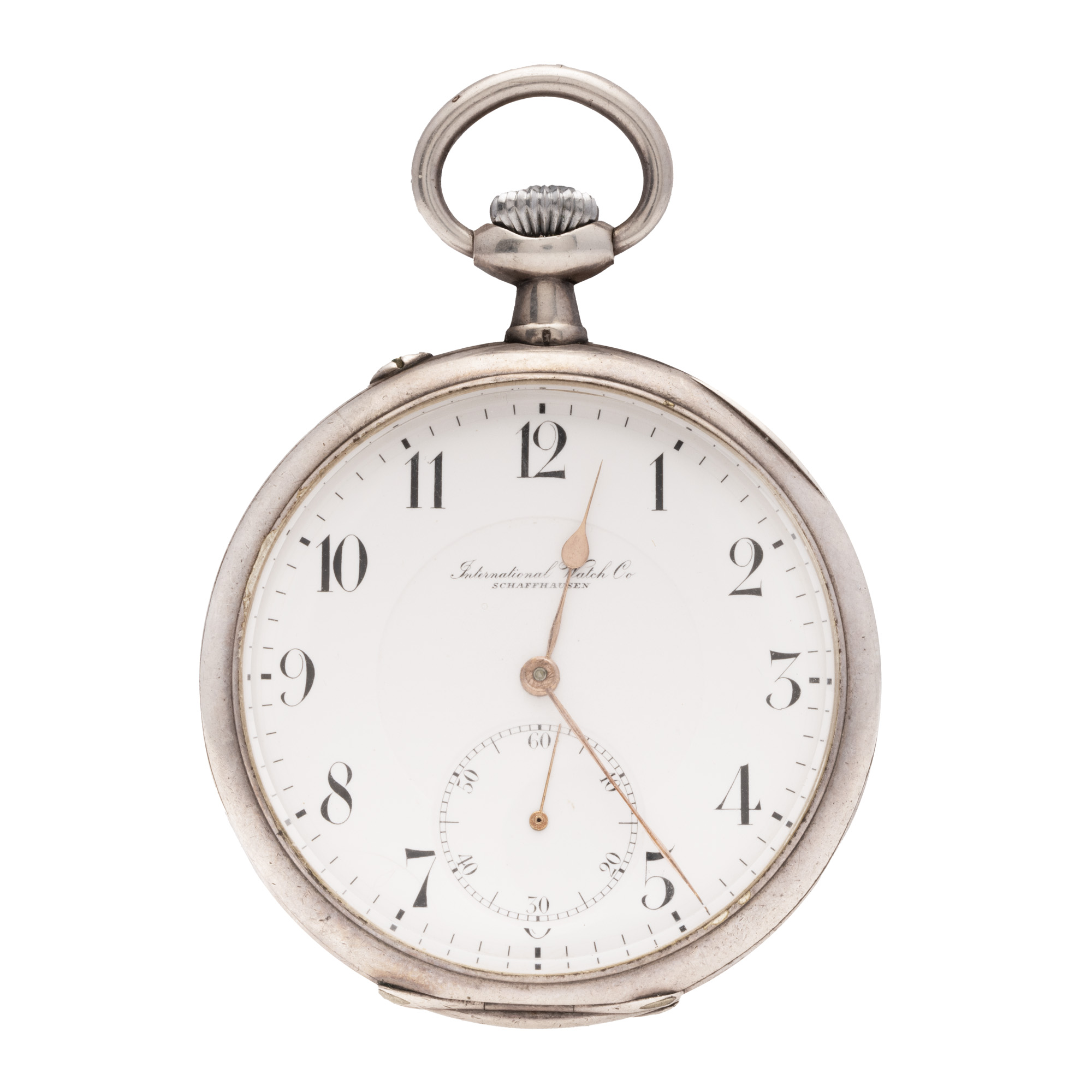 Ceas IWC, din argint, de buzunar, bărbătesc. Mecanism cu armare manuală. Cadran de culoare alb, indici numerale arabe, registru pentru secundar în dreptul orei 6.