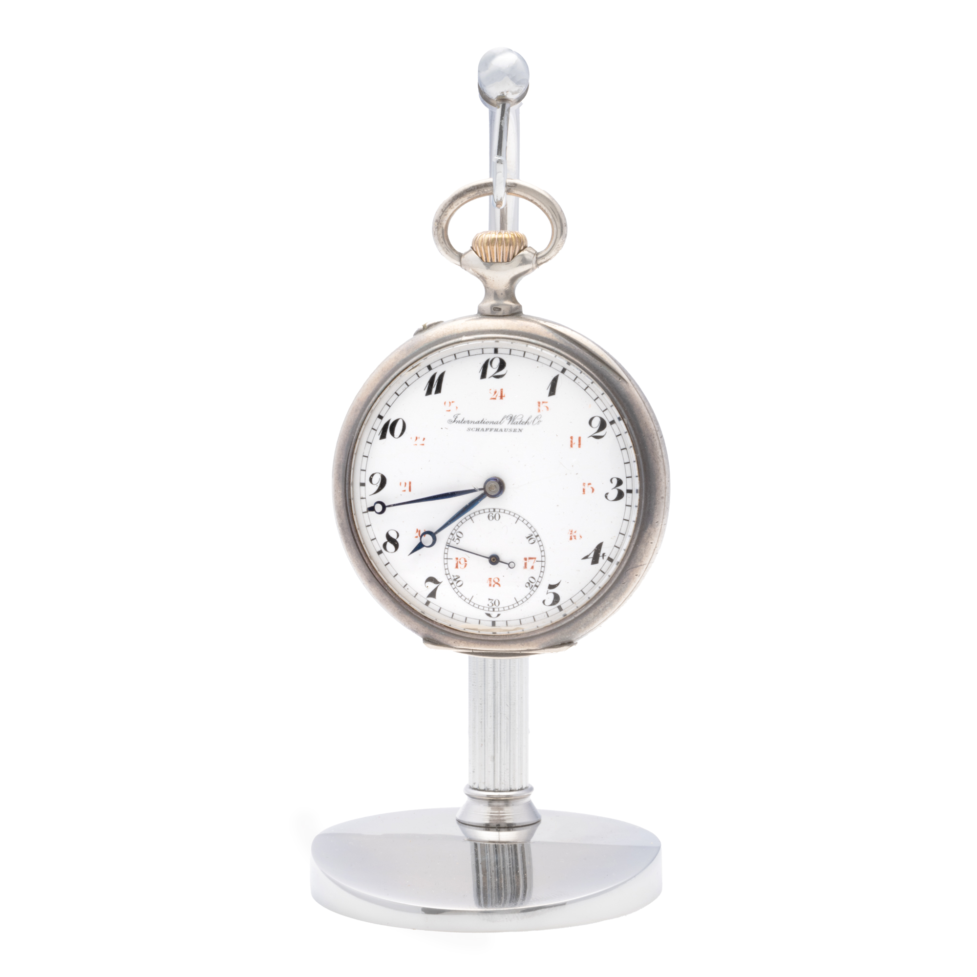 Ceas IWC, din argint, de buzunar, însoțit de stativ. Mecanism cu armare manuală, cadran de culoare alb-porțelanat, indici cu numerale arabe dublați de indici pentru minute, cu un registru pentru secundar în dreptul orei 6.