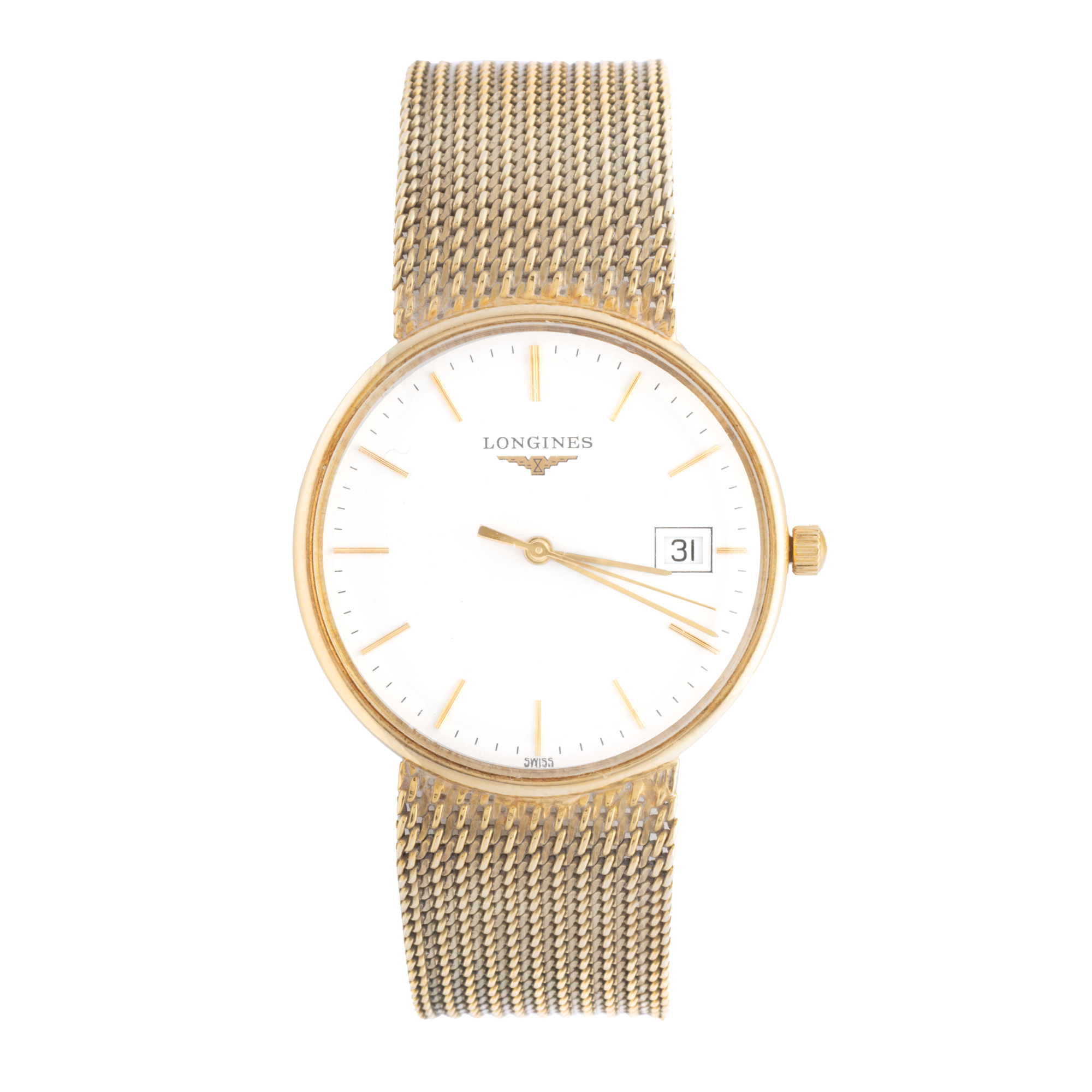 Ceas Longines Calatrava, din aur, de mână, unisex. Mecanism quartz. Cadran de culoare alb, indici baghete, registru pentru dată în dreptul orei 3. Brățară originală, din aur, cu sistem de închidere de tip clemă.