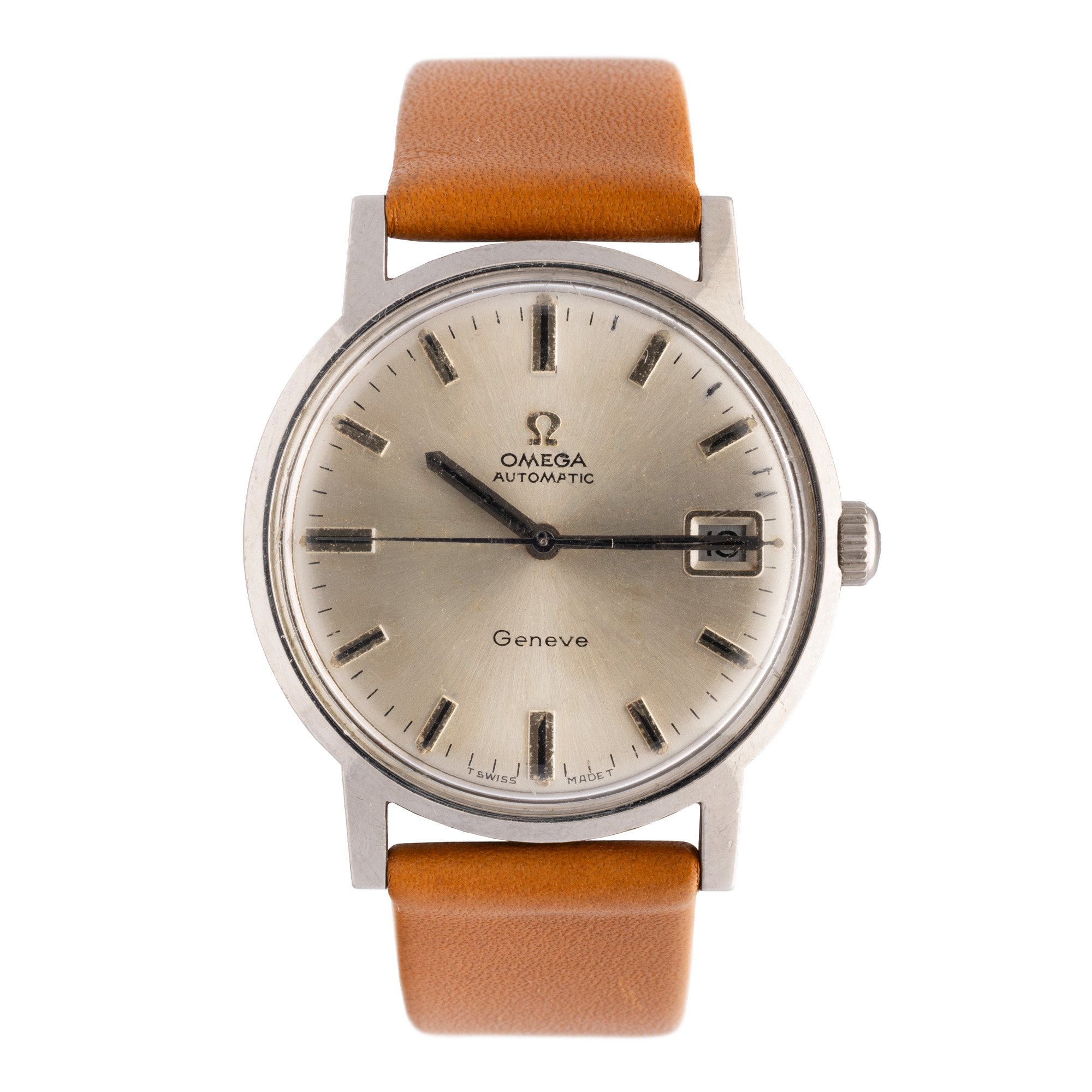 Ceas Omega Geneve, de mână, bărbătesc. Mecanism automatic. Cadran de culoare argintiu, indici baghete, registru pentru dată în dreptul orei 3. Curea adăugată aftermarket, din piele, de culoare maronie, cu sistem de închidere de tip clasic cu cataramă.