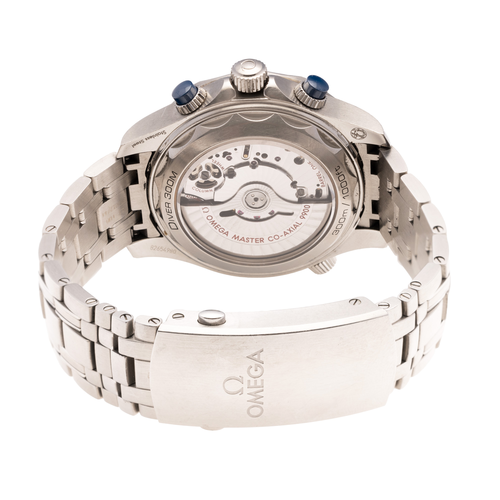 Ceas Omega Seamaster Professional Chronograph, de mână, bărbătesc, referință 210.30.44.51.03.001. Mecanism automatic, calibrul 9900, anterior vitrat. Cadran de culoare albastru texturat, indici orari circulari, cu un registru pentru funcția de chronograph în dreptul orei 3, un registru pentru dată în dreptul orei 6 și un registru pentru secundar în dreptul orei 9. Brățară originală, din oțel inoxidabil, cu sistem de închidere de tip deployant.
