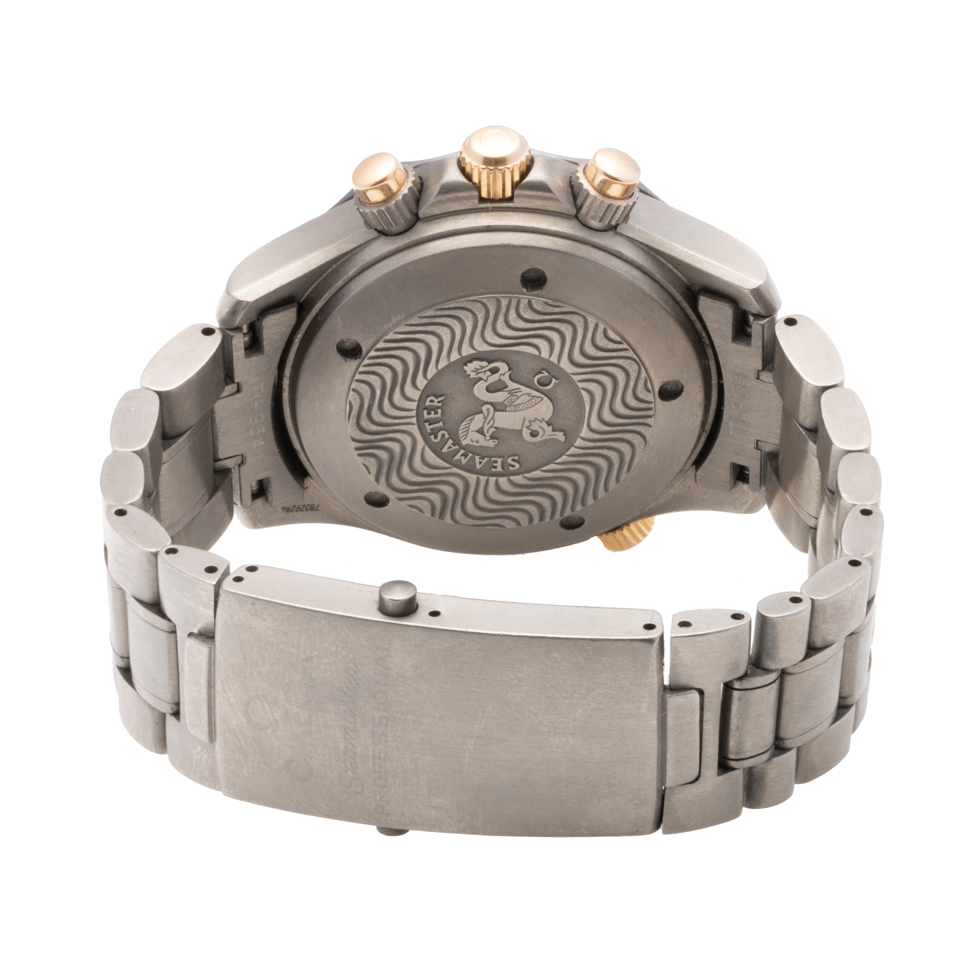 Ceas Omega Speedmaster Professional America's Cup, din titan și aur, de mână, bărbătesc, referință 2294.50. Mecanism automatic, calibrul 3303. Cadran de culoare negru, indici baghetă, cu un registru pentru secundar în dreptul orei 9, un registru pentru dată în dreptul orei 6 și două registre pentru funcția de chronograph în dreptul orelor 3 și 6. Brățară originală, din titan, cu sistem de închidere de tip deployant. Observații: brățara a fost scurtată prin înlăturarea a două zale care vor fi livrate separat.