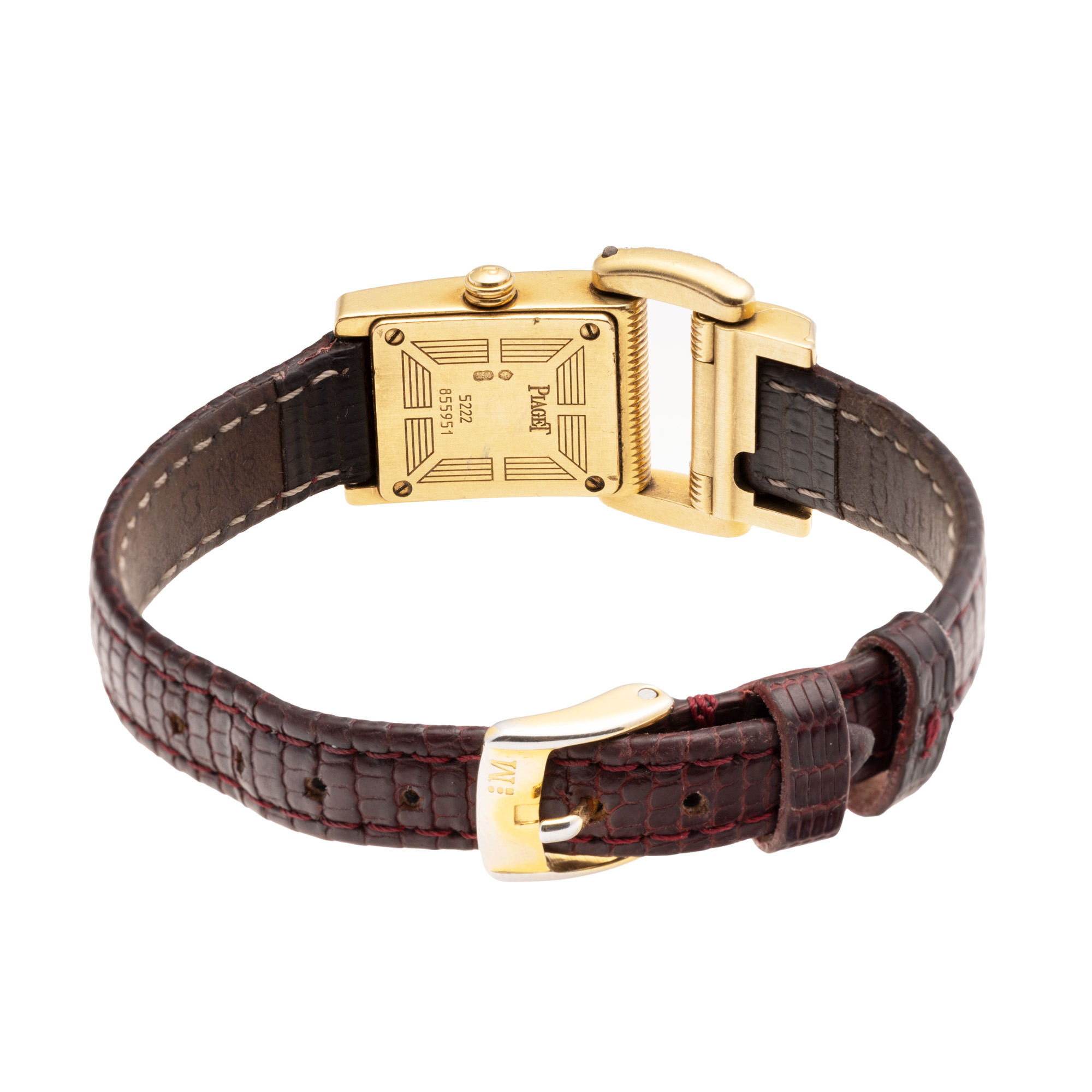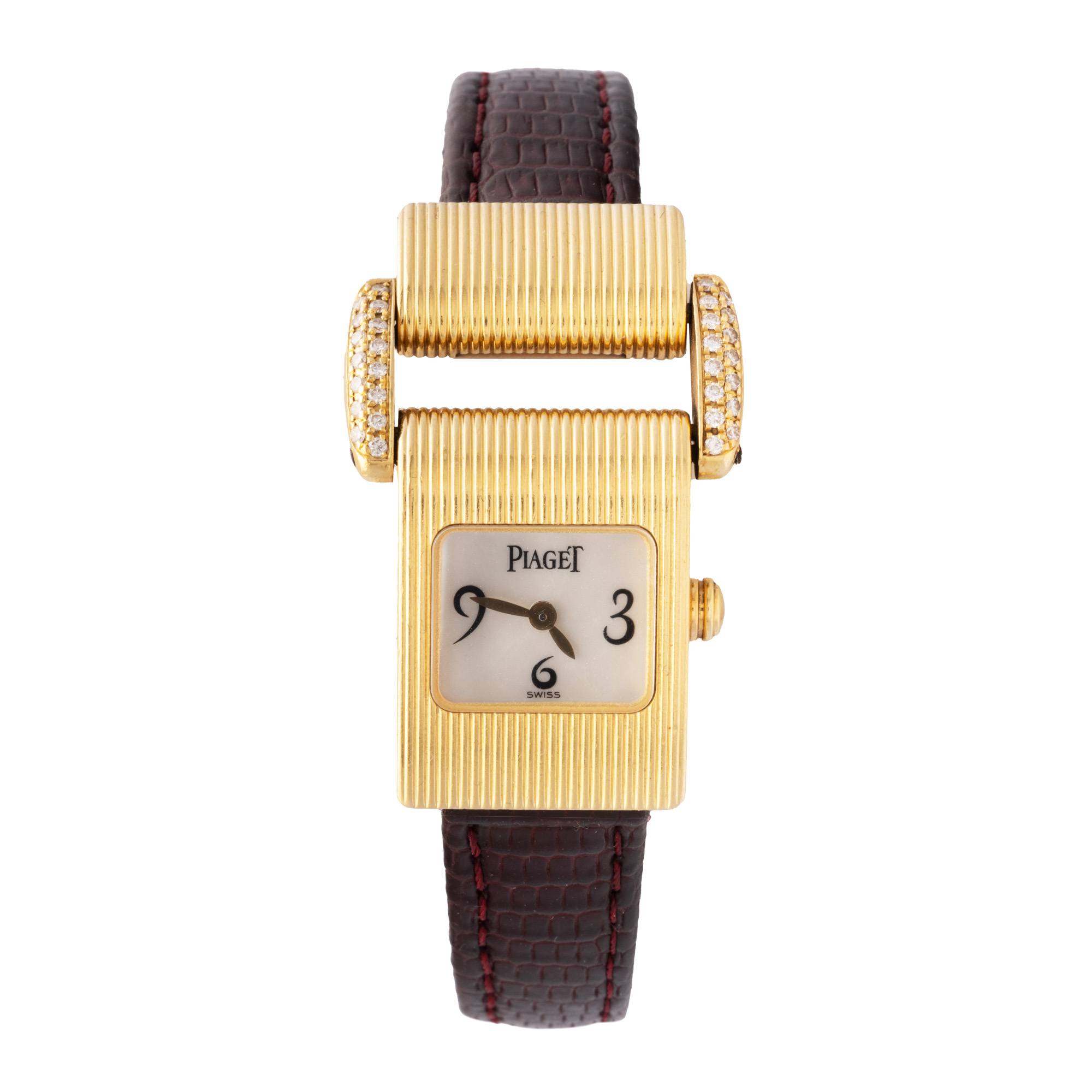 Ceas Piaget Miss Protocole, din aur, cu diamante, de mână, de damă. Mecanism quartz, cadran din sidef, indici cu numerale arabe pentru orele 3, 6 și 9. Curea adăugat aftermarket, din piele, de culoare maro, cu sistem de închidere de tip clasic.