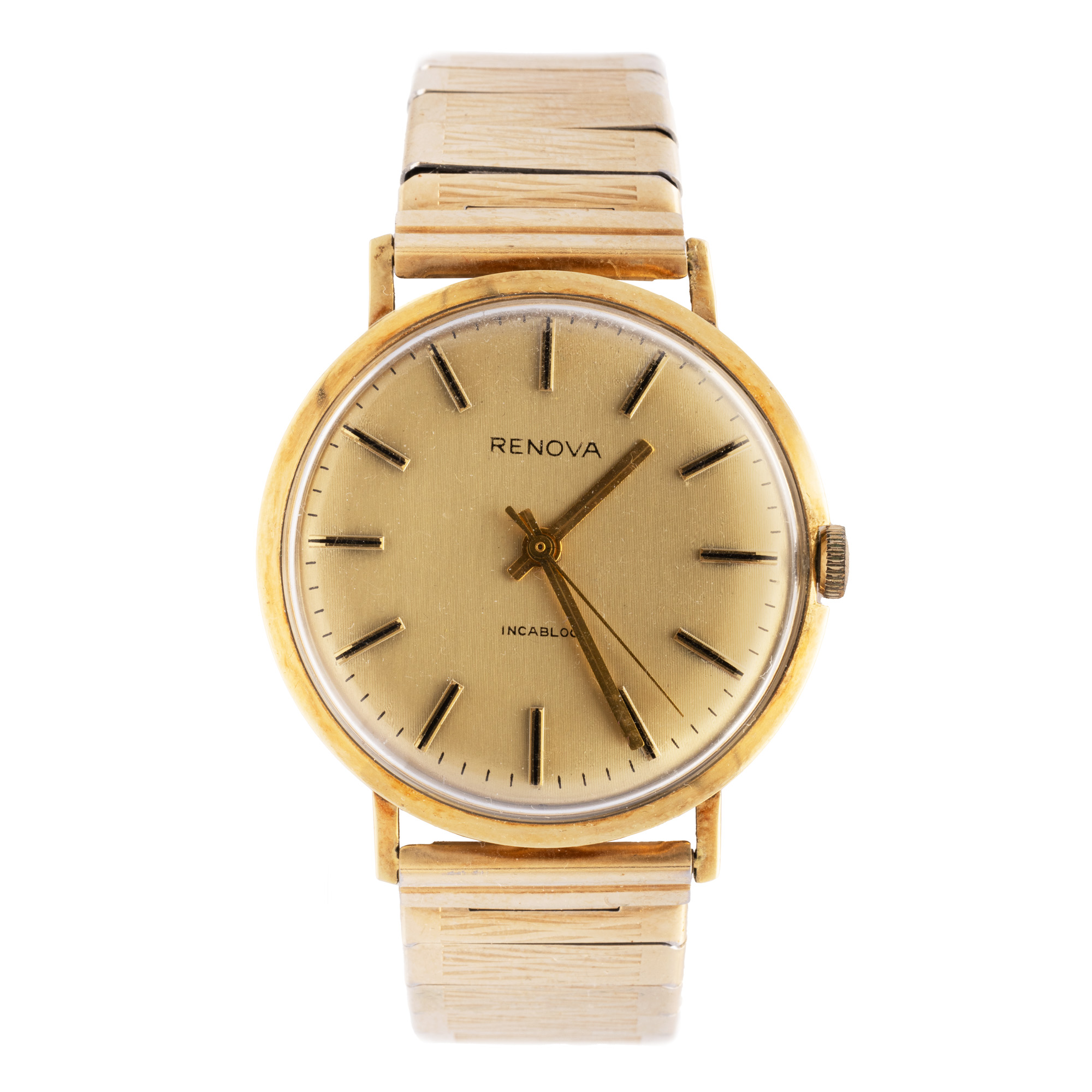 Ceas Renova, din aur, de mână, bărbătesc. Mecanism cu armare manuală. Cadran de culoare auriu, indici liniari aplicați. Brățară de tip "stretch", din oțel inoxidabil aurit.