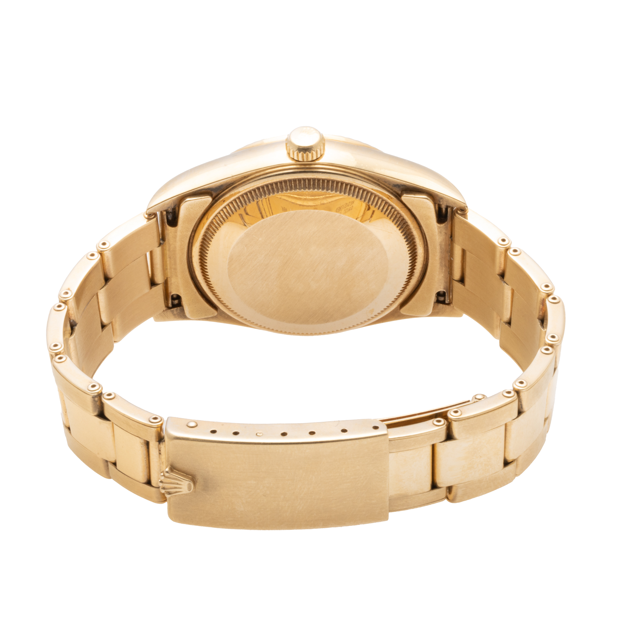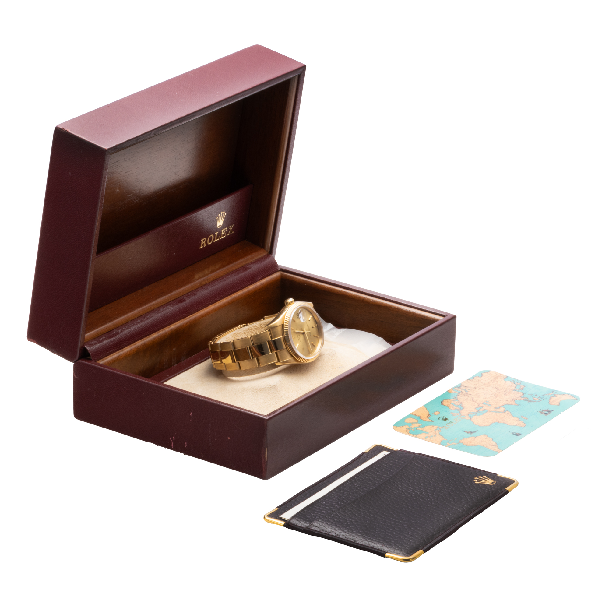 16. Ceas Rolex Oyster Perpetual Date, din aur, de mână, bărbătesc, însoțit de cutia originală, za suplimentară, certificat de atestare a chronometrului și garanție, portcard și calendar [1995]