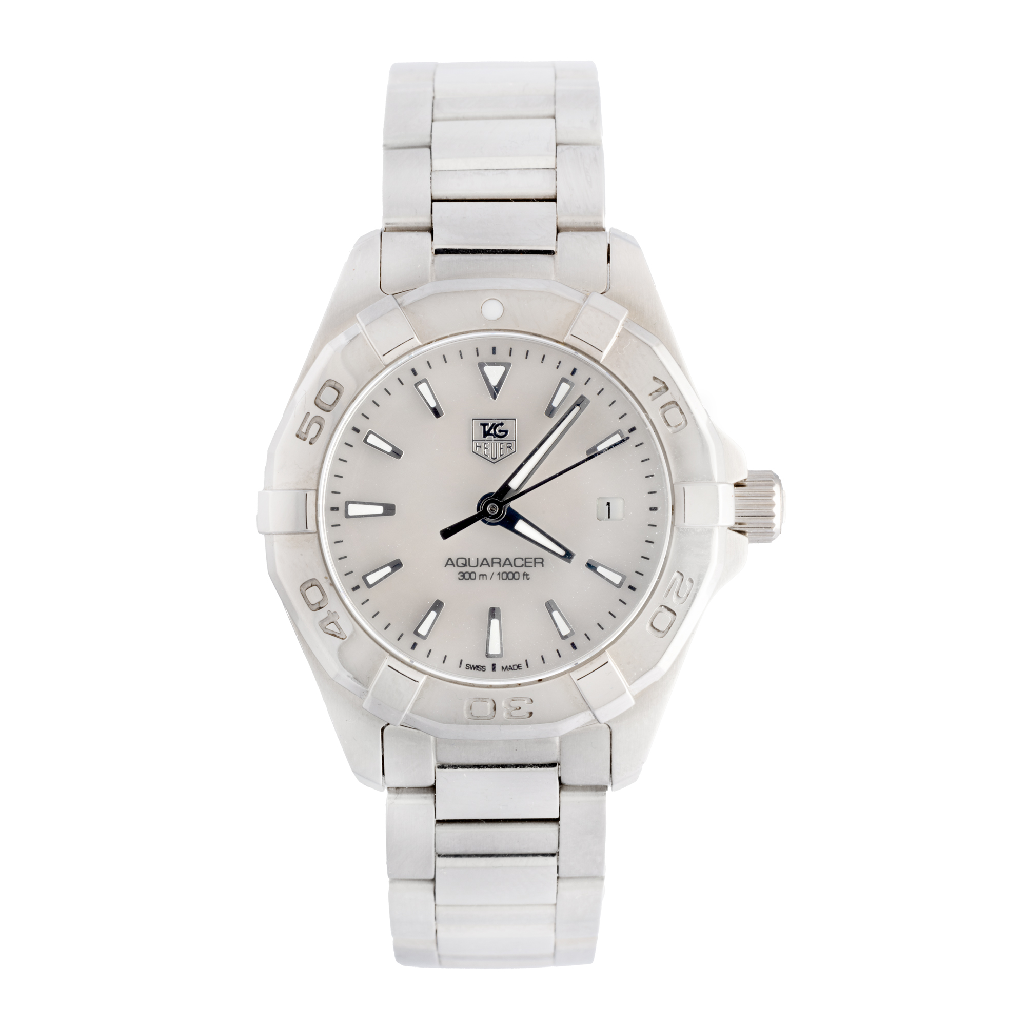 Ceas Tag Heuer Aquaracer, de mână, de damă, referință WAY1412. Mecanism quartz, bezel mobil unidirecțional. Cadran din sidef, indici baghete, registru pentru dată în dreptul orei 3. Brățară originală, din oțel, cu sistem de închidere de tip deployant.