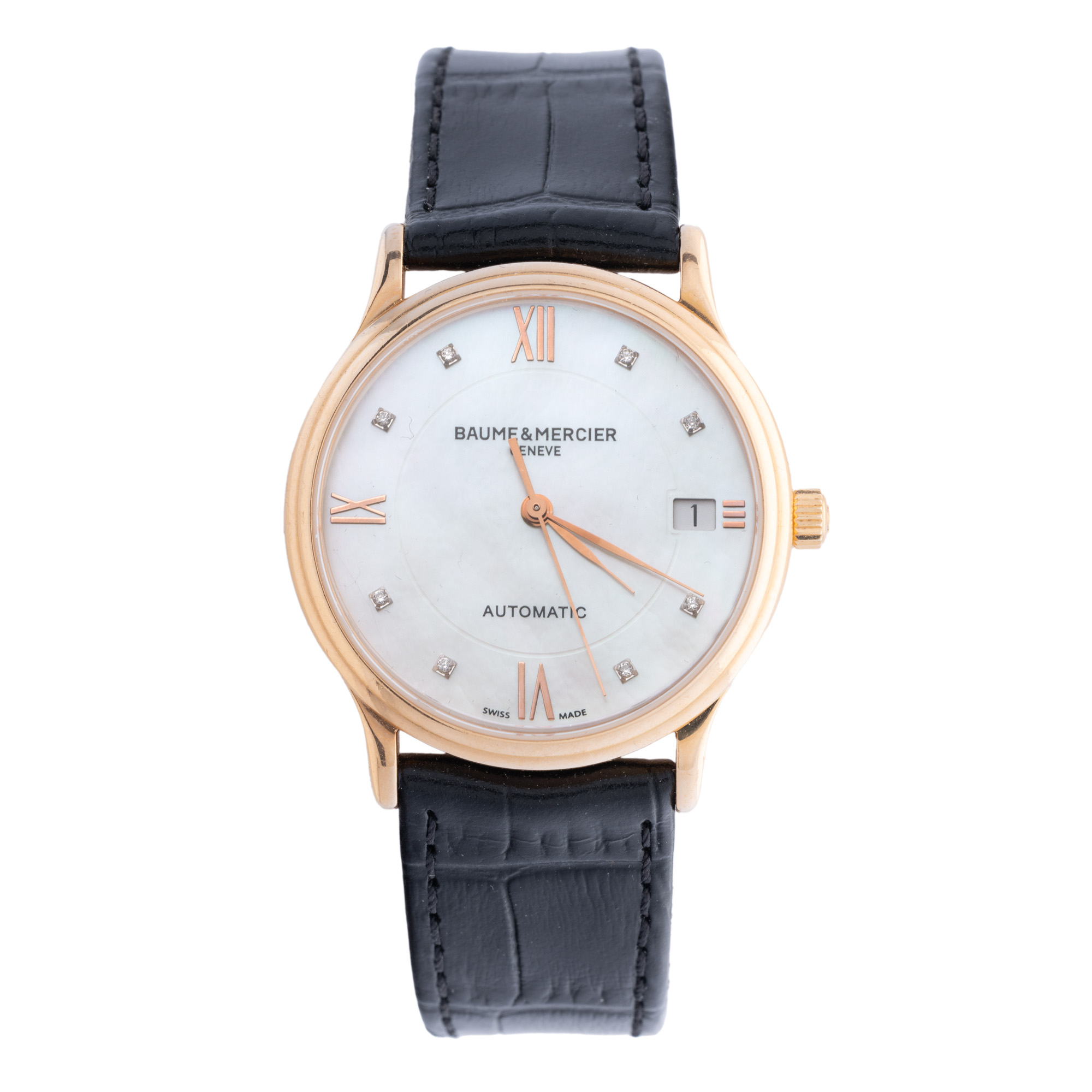 Ceas Baume & Mercier Classima, din aur, cu diamante, de mână, unisex, referință MOA 10077. Mecanism automatic, cu 21 de rubine, anterior vitrat. Cadran din sidef, indici numerale romane pentru orele 3, 6, 9, 12 și diamante pentru restul orelor, registru pentru dată în dreptul orei 3. Curea adăugată aftermarket, din piele, de culoare neagră, cu sistem de închidere clasic, cu catarama originală din aur.