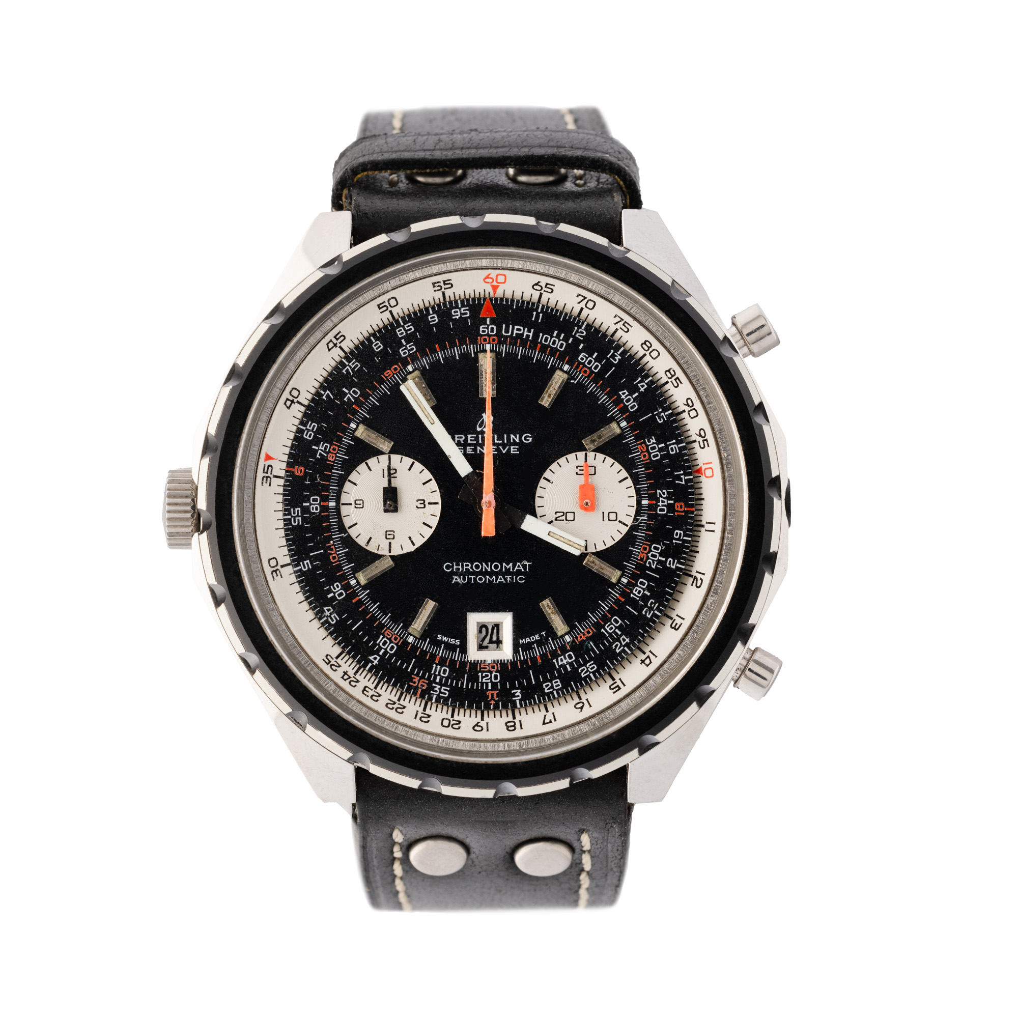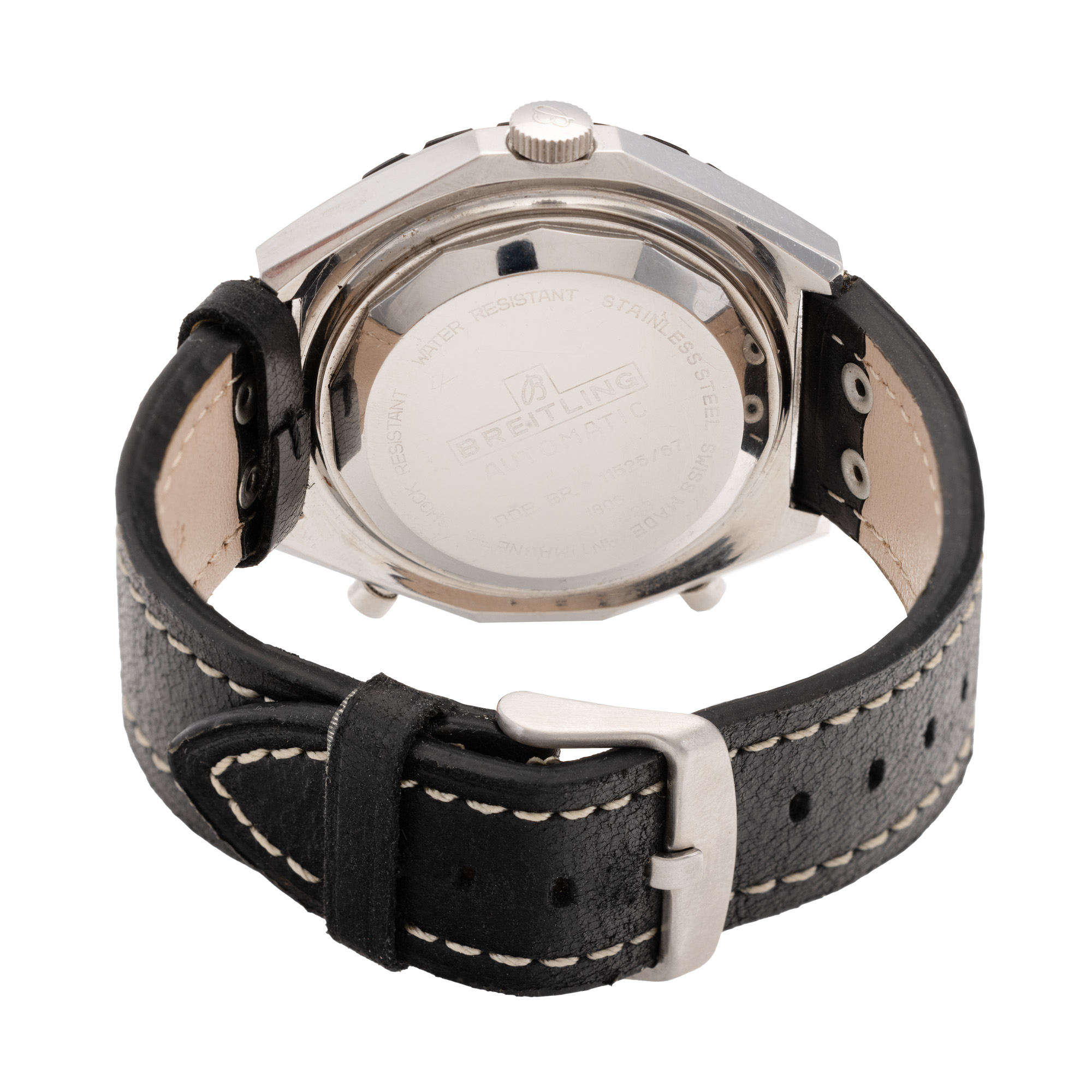 Ceas Breitling Chronomat, de mână, bărbătesc, referință 1808. Mecanism automatic, calibrul 12 (Lemania 1873), cu funcție de chronograph. Cadran de culoare negru, indici liniari, cu un registru pentru dată în dreptul orei 6 și două registre pentru funcția de chronograph în dreptul orelor 3 și 9. Curea adăugată aftermarket, din piele, de culoare neagră, cu sistem de închidere de tip clasic.