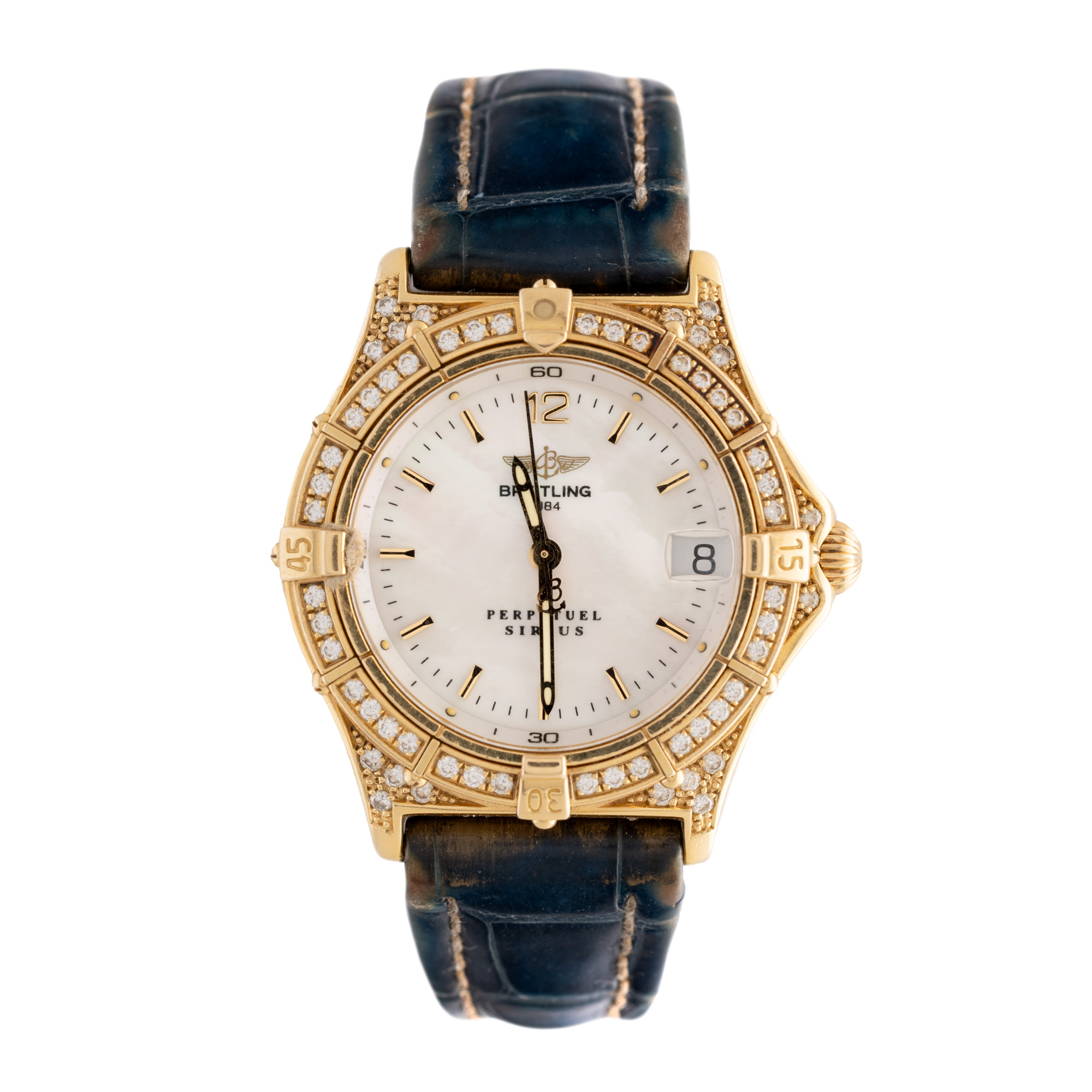 Ceas Breitling Perpetuel Sirius, din aur, cu diamante, de mână, de damă, referință K62022. Mecanism quartz, cadran din sidef, indici liniari, cu un registru pentru dată cu lupă în dreptul orei 3. Curea originală, din piele, de culoare albastră, cu sistem de închidere de tip deployant.