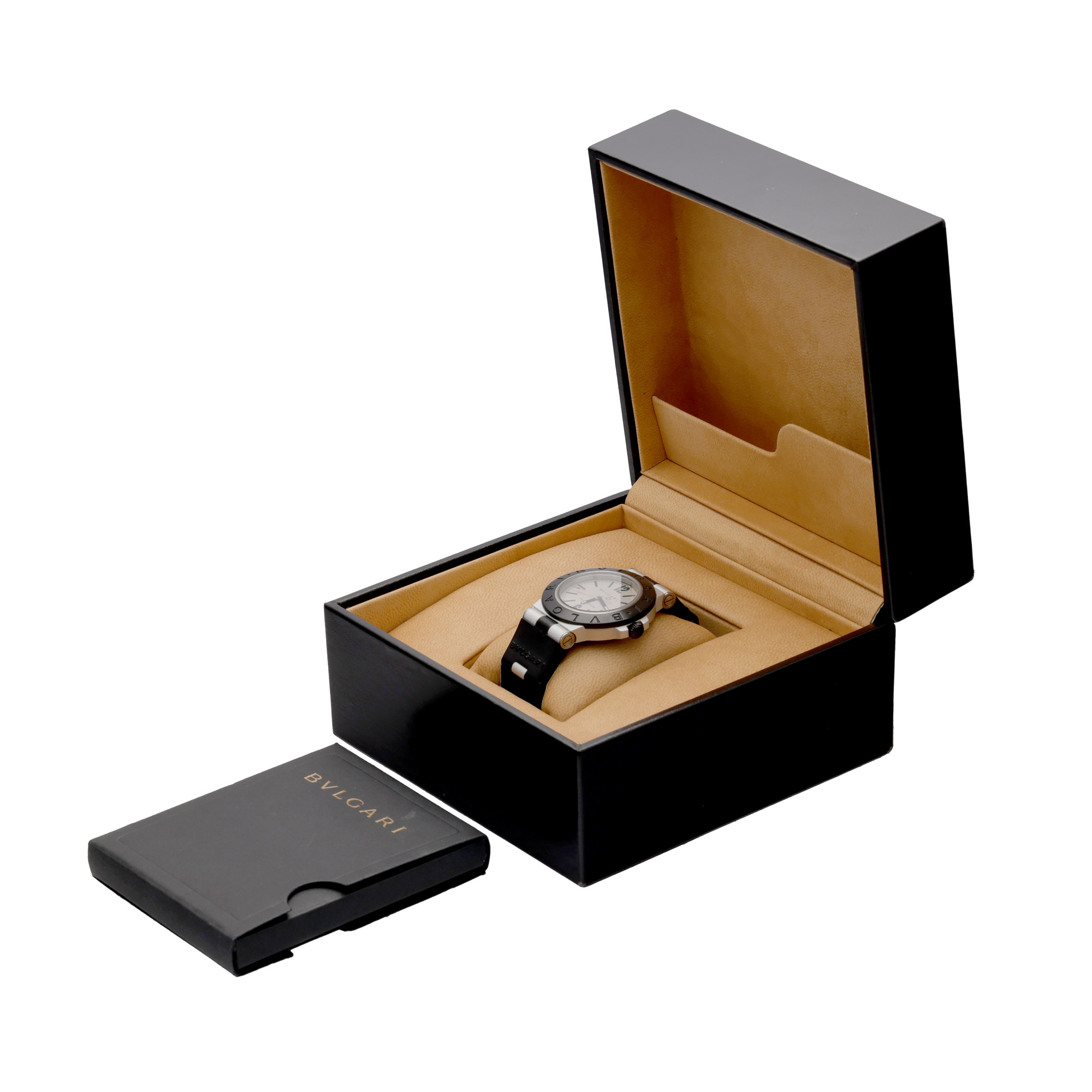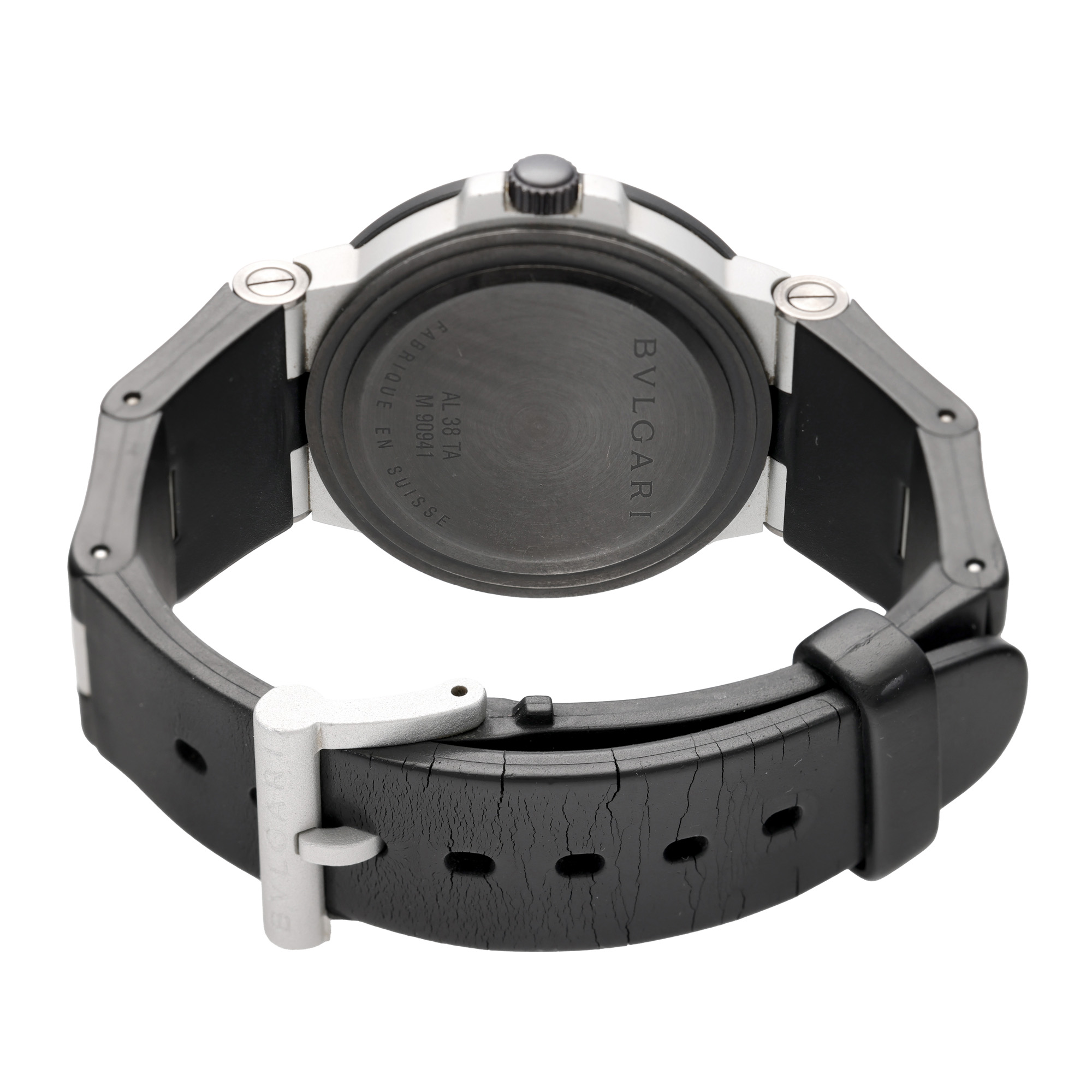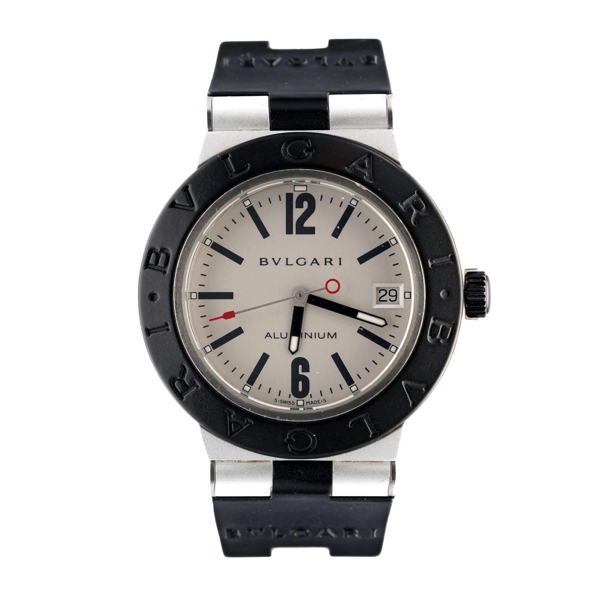 Ceas Bvlgari Diagono Aluminium, din aluminiu, de mână, unisex, referință AL38A. Mecansim automatic, calibrul 220. Cadran de culoare alb, indici cu numerale arabe pentru orele 12 și 6, indici liniari pentru restul orelor, cu un registru pentru dată în dreptul orei 3. Curea originală din cauciuc, cu îmbinări din aluminiu, cu sistem de închidere de tip clasic. Accesorii: cutia originală, card de garanție, certificat de autenticitate și broșuri.