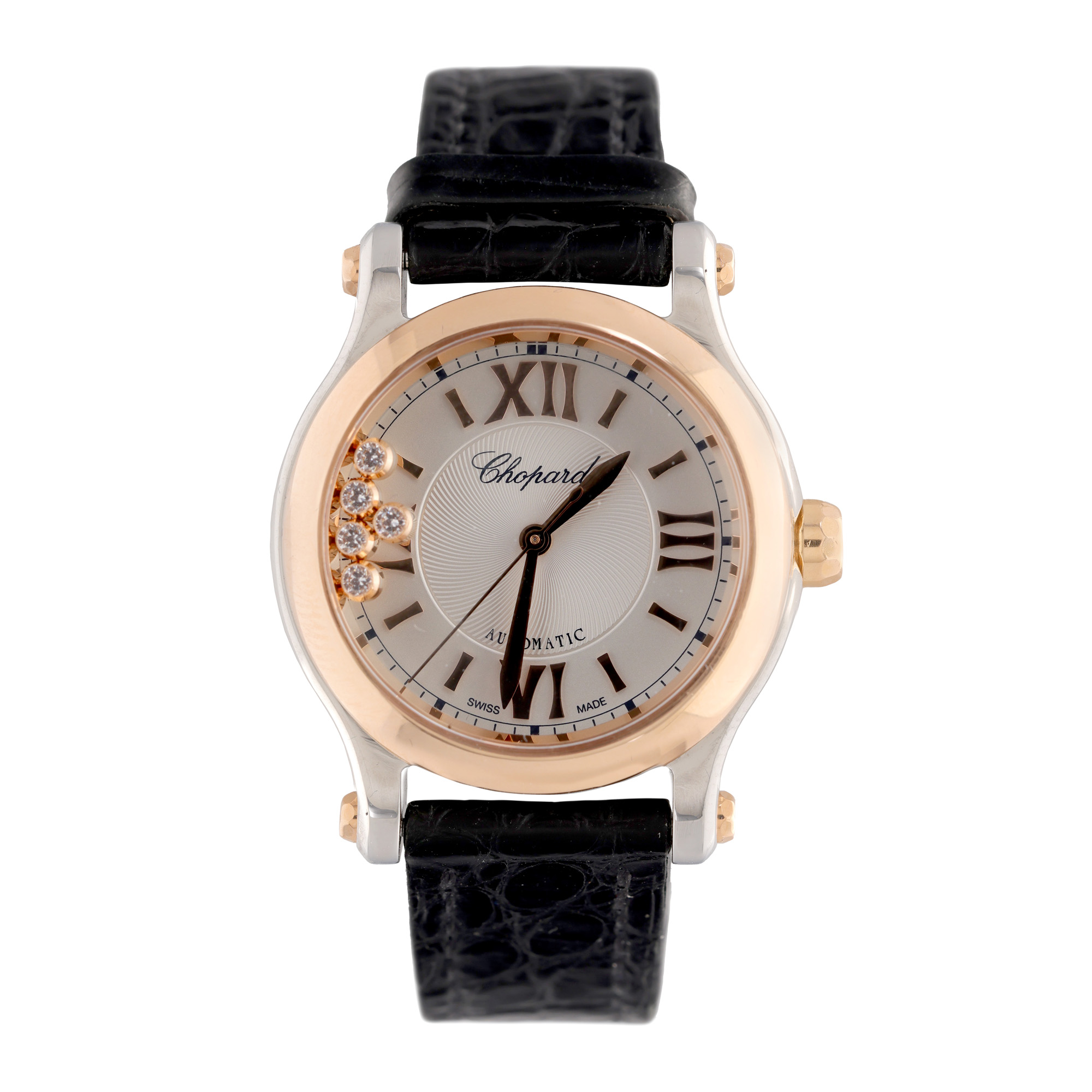 Ceas Chopard Happy Sport, din aur și oțel, cu diamante, de mână, de damă, referință 8573. Mecanism automatic, calibrul 09.01.C, anterior vitrat. Cadran de culoare argintiu, decorat cu diamante mobile, indici numerale romane pentru orele cardinale și baghete pentru restul orelor, Curea originală, din piele, de culoare neagră, cu sistem de închidere clasic cu catarama originală. Accesorii: borseta originală.
