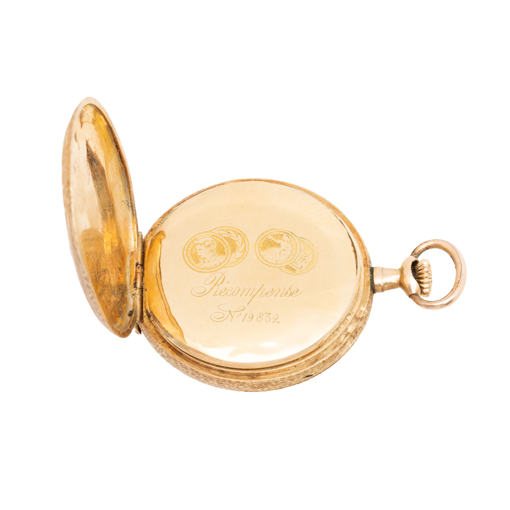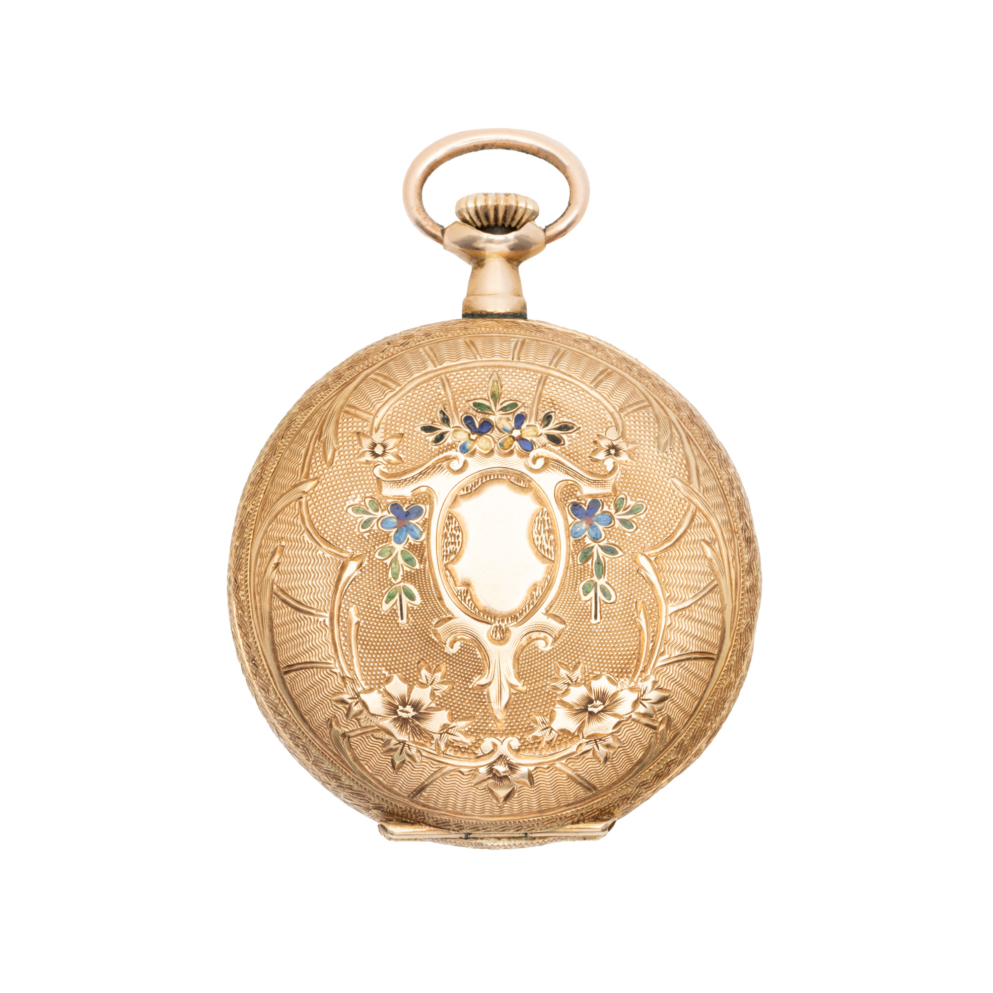 Ceas din aur, de buzunar, decorat cu email. Mecanism cu armare manuală. Cadran de culoare alb, indici numerale arabe, registru pentru secundar în dreptul orei 6. Accesorii: cutia originală. Observații: geamul cadranului lipsește.