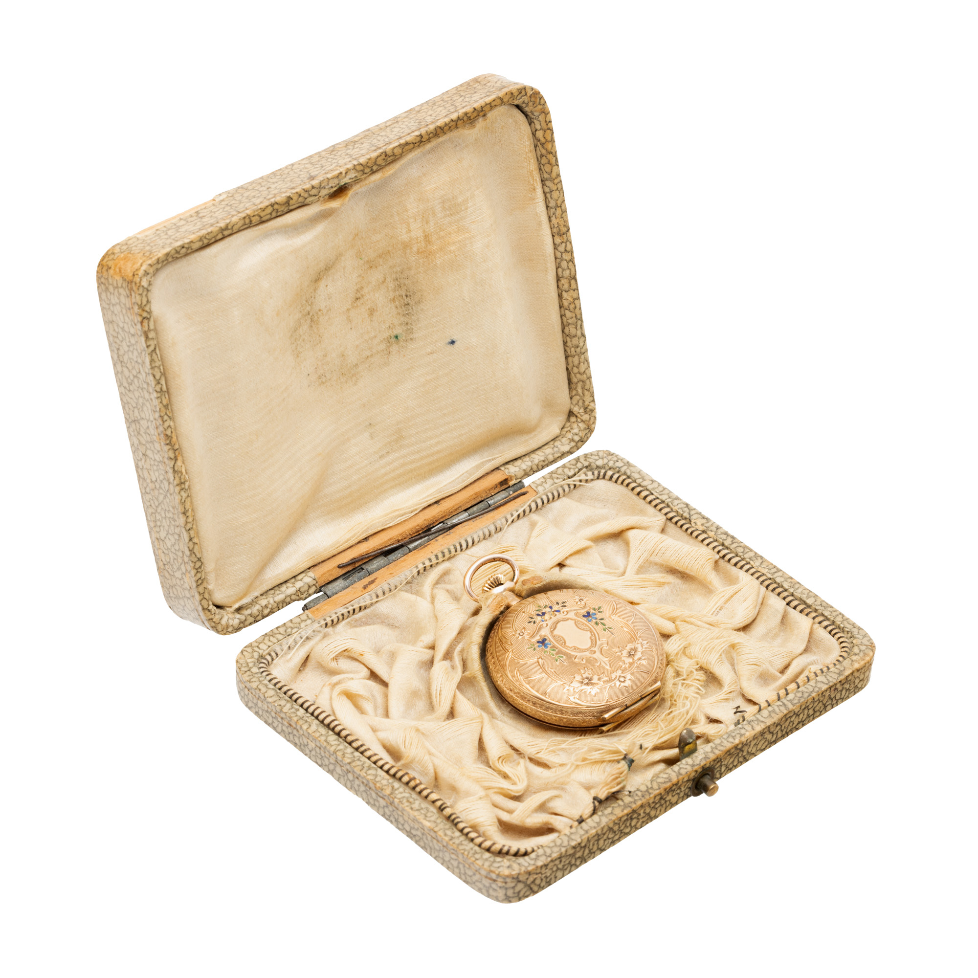 81. Ceas din aur, de buzunar, decorat cu email, însoțit de cutia originală [Cca. 1920]