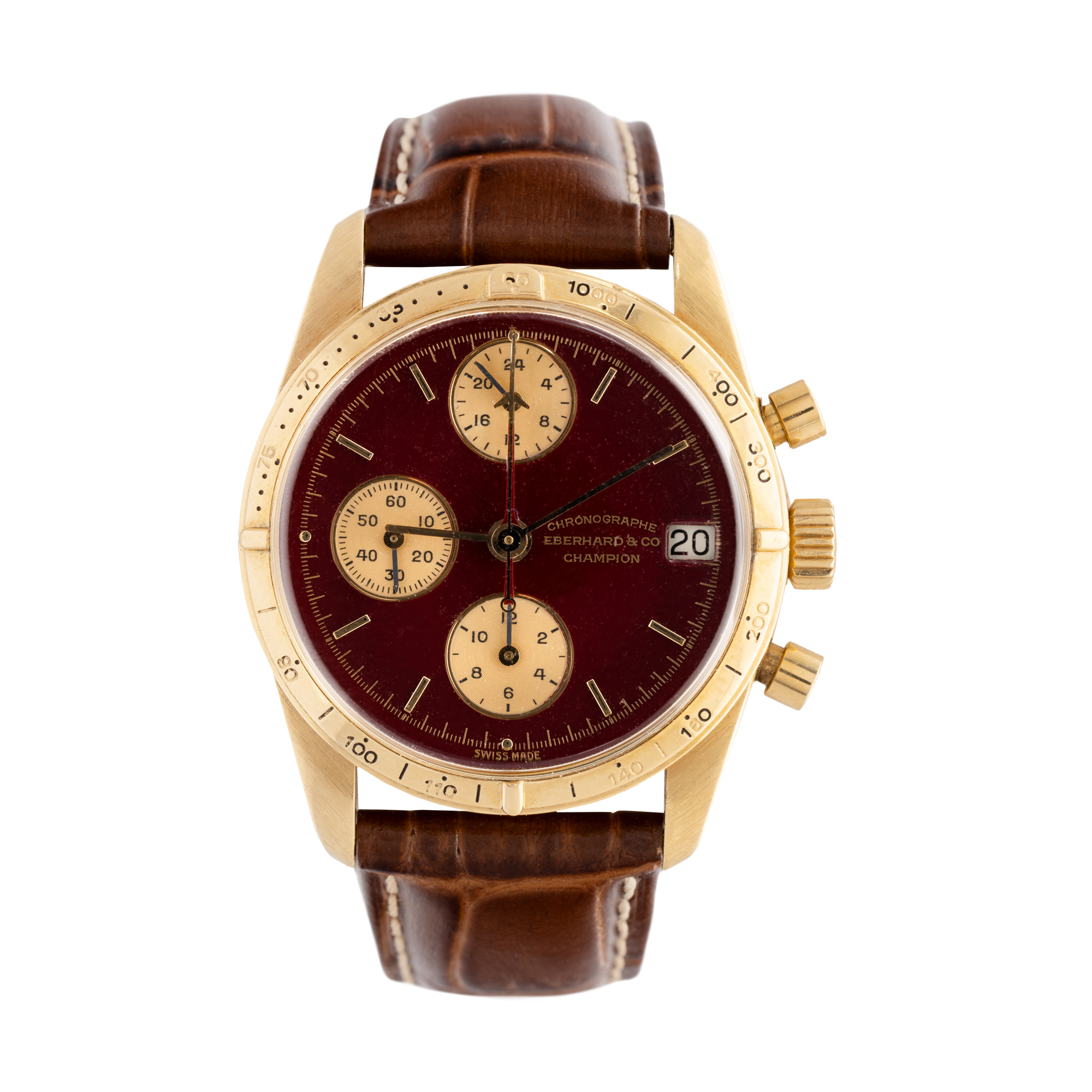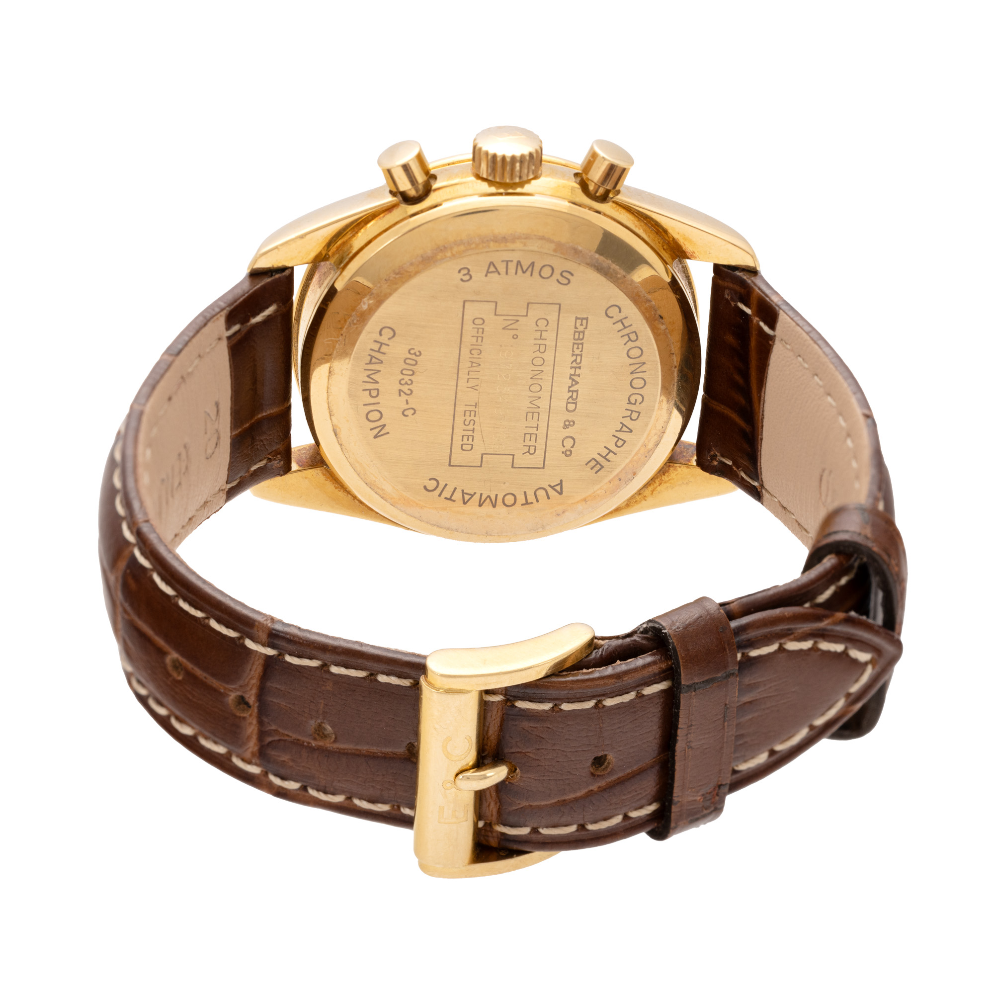 Ceas Eberhard & Co Champion Chronograph, din aur, de mână, bărbătesc, referință 30032-C. Mecanism automatic cu funcție de chronograph. Cadran de culoare burgundy, două registre pentru chronograph în dreptul orelor 6 și 12, registru pentru secundar în dreptul orei 9, registru pentru dată în dreptul orei 3. Curea din piele, adăugată aftermarket, de culoare maro, sistem de închidere clasic cu catarama originală.