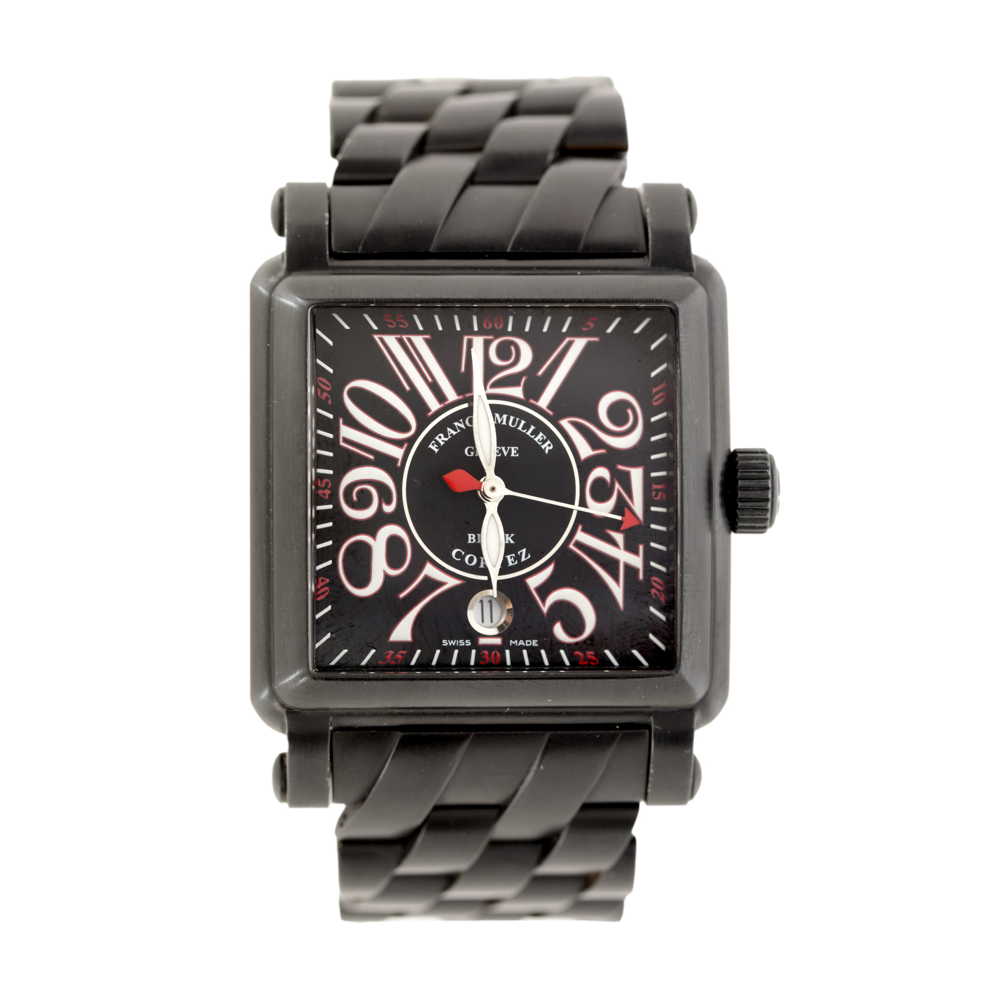 Ceas Franck Muller Black Cortez Conquistador, de mână, bărbătesc, referință 10000 H SC NR. Mecanism automatic. Cadran curbat, de culoare negru cu indici numerale arabe și registru pentru dată în dreptul orei 6. Carcasa și brățara placate cu PVD negru. Brățara originală, din oțel, cu sistem de închidere de tip deployant.