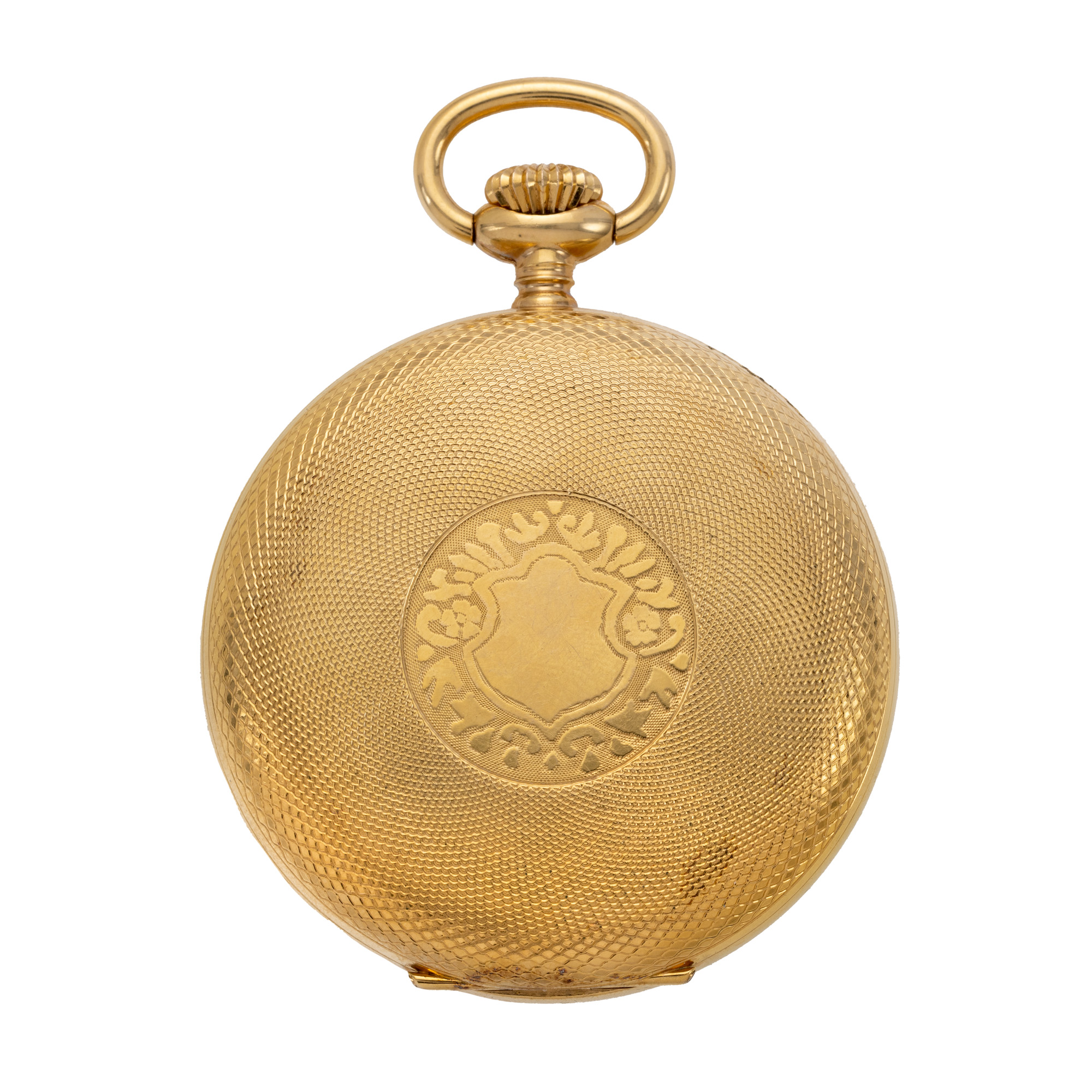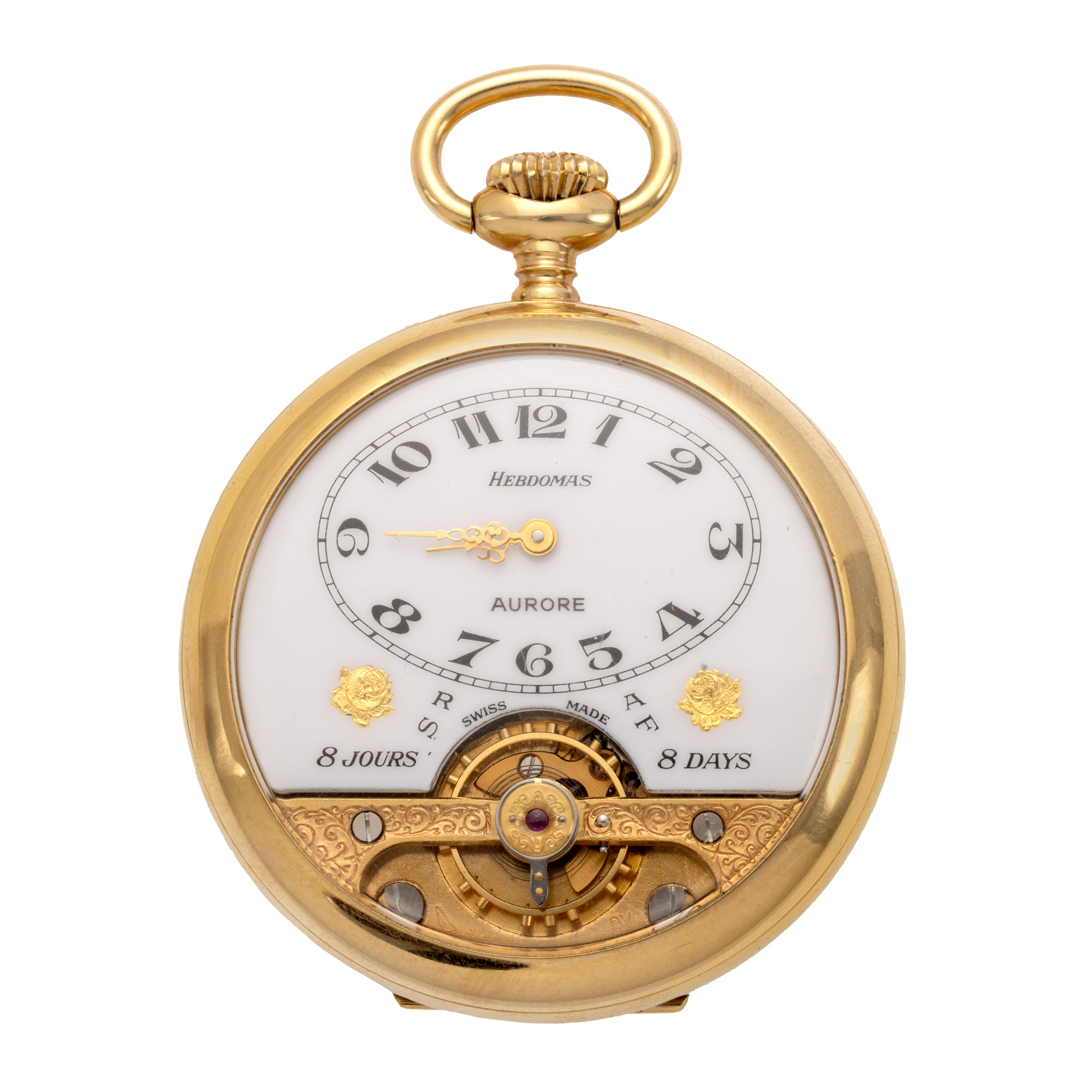 Ceas Hebdomas Aurore din aur, de buzunar, bărbătesc. Mecanism cu armare manuală cu o rezervă de putere de 8 zile. Cadran de culoare alb emailat, indici cu numerale arabe, cu balansul mecanismului expus în dreptul orei 6.