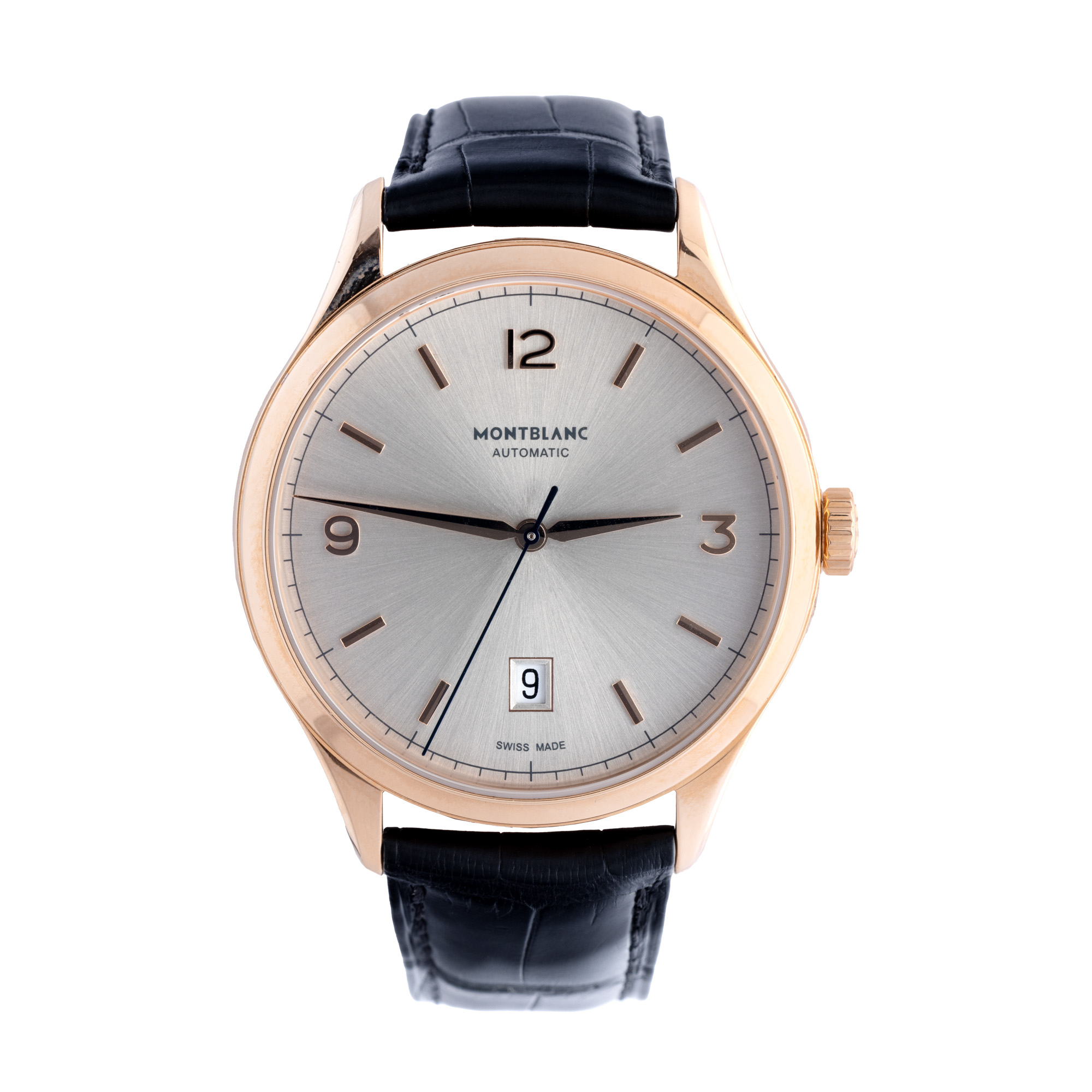 Ceas Montblanc Heritage, din aur, nou, referință 114869. Mecanism automatic, calibrul 2824, anterior vitrat. Cadran de culoare champagne, indici cu numerale arabe pentru orele 12, 3 și 9, inidici baghetă pentru restul orelor, cu un registru pentru dată în dreptul orei 6. Curea originală, din piele, de culoare neagră, cu sistem de închidere de tip clasic. Accesorii: cutia originală, card de garanție.