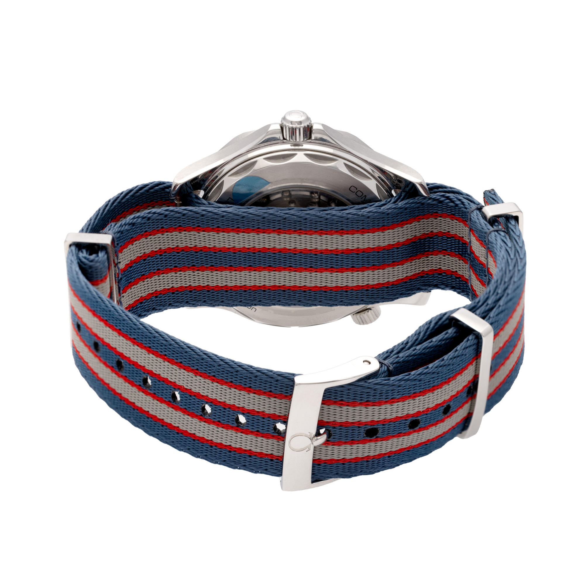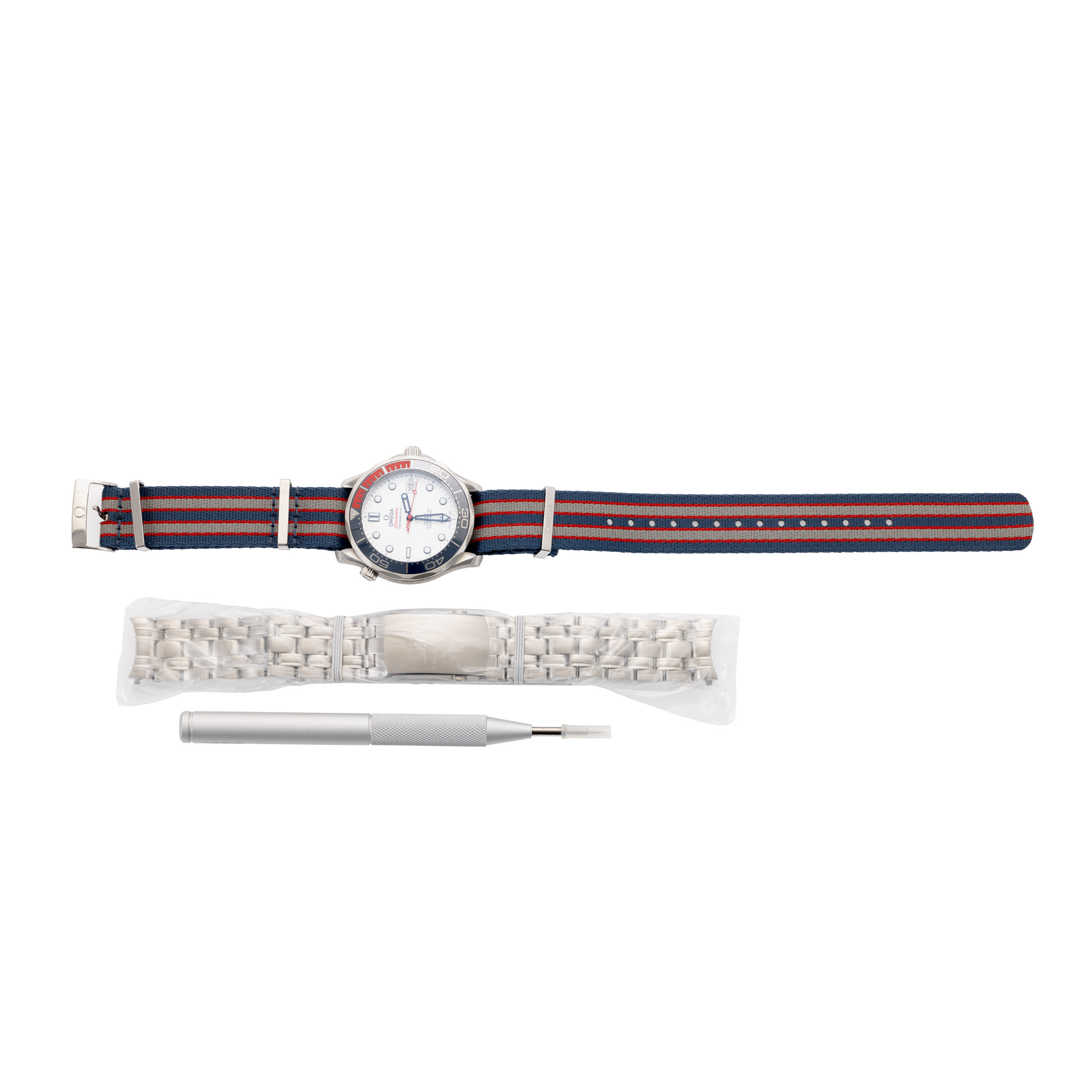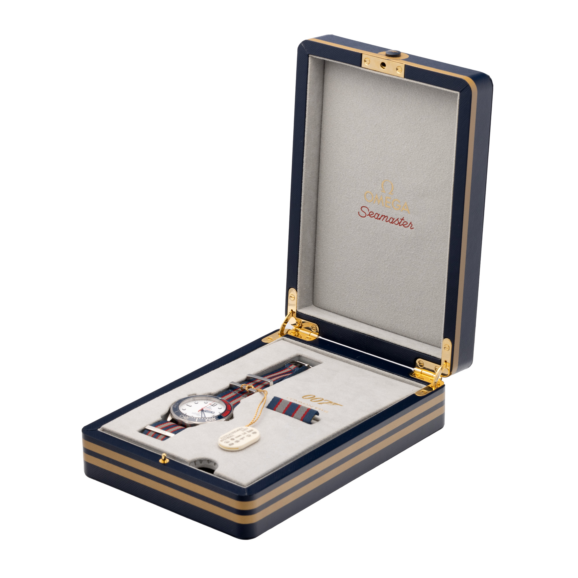 Ceas Omega Seamaster Comander's Watch ediție limitată James Bond Nr.2257/7007, de mână, bărbătesc, referință 212.32.41.20.04.001. Mecanism automatic, calibrul 2507, anterior vitrat. Cadran de culoare alb, decorat cu valuri în relief, indici circulari aplicați, cu un registru pentru dată în dreptul orei 3. Curea originală, din material textil, multicoloră, cu sistem de închidere de tip clasic. Accesorii: cutia originală, brățară de schimb, certificat de autenticitate, manual de instrucțiuni și carduri de garanție.