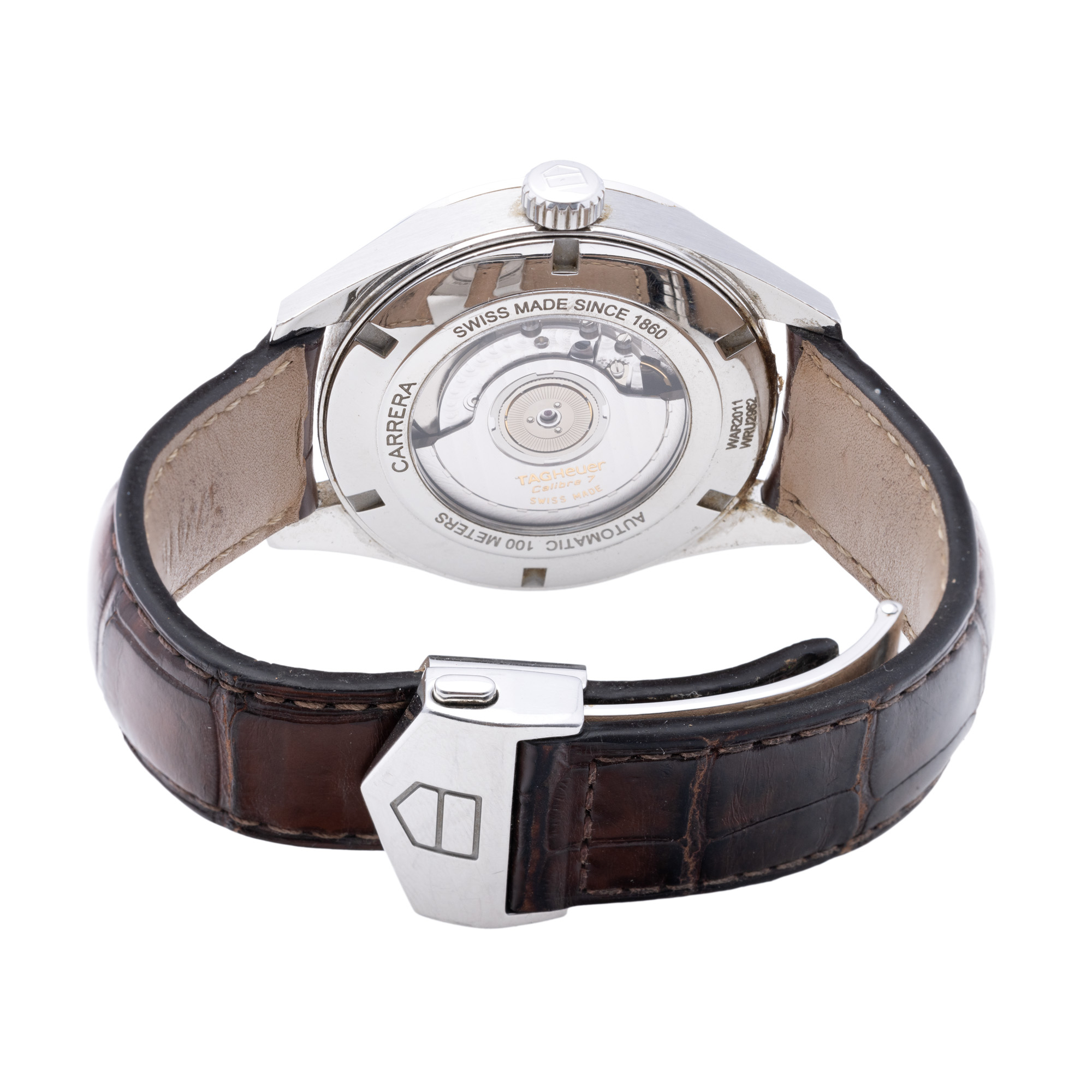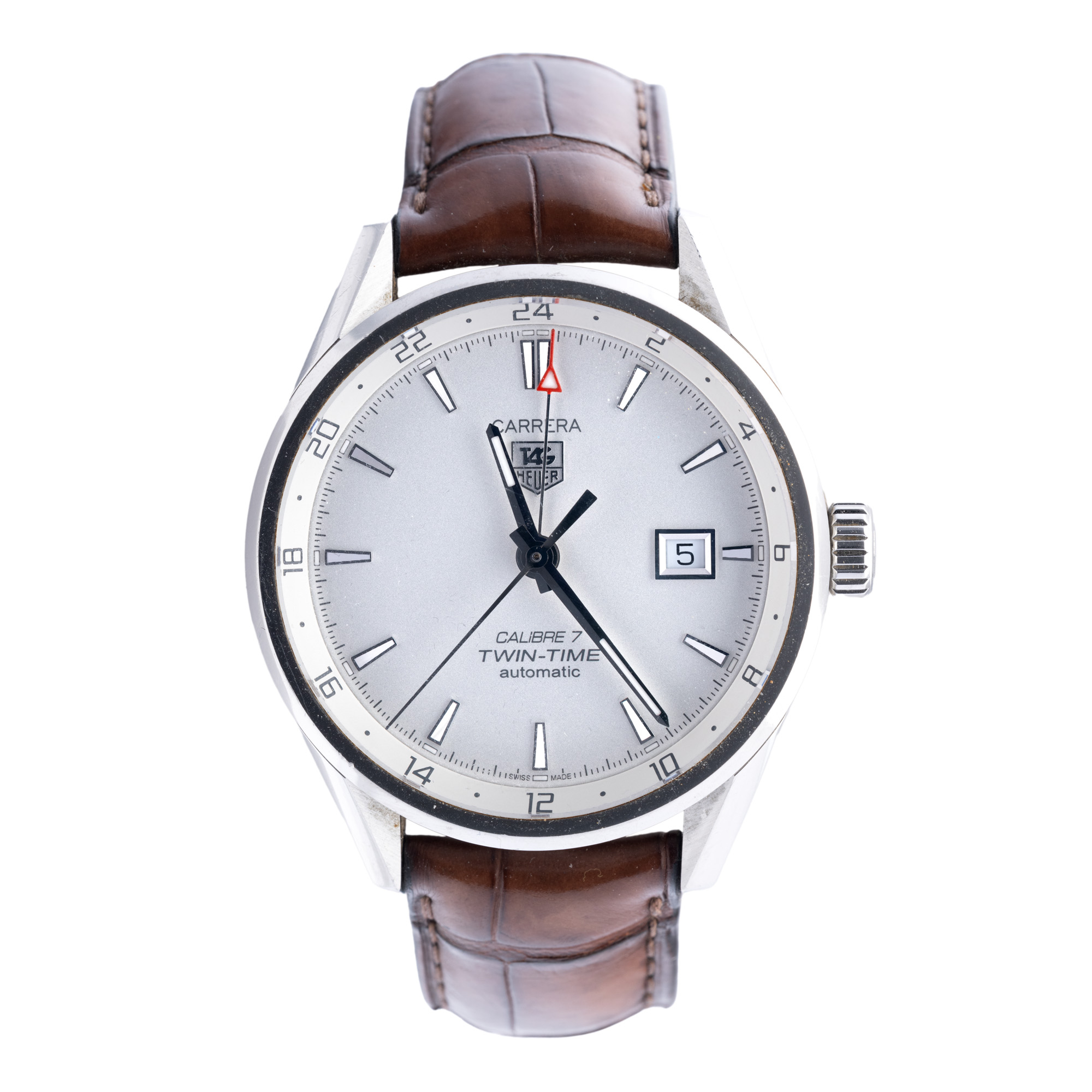 Ceas Tag Heuer Carrera Twin Time, de mână, bărbătesc, referință WAR2011.FC6291. Mecanism automatic, calibrul 7, cu funcție de GMT, anterior vitrat. Cadran de culoare alb, indici baghetă, cu registrul pentru dată în dreptul orei 3. Curea originală din piele, de culoare maro, cu sistem de închidere de tip deployant.
