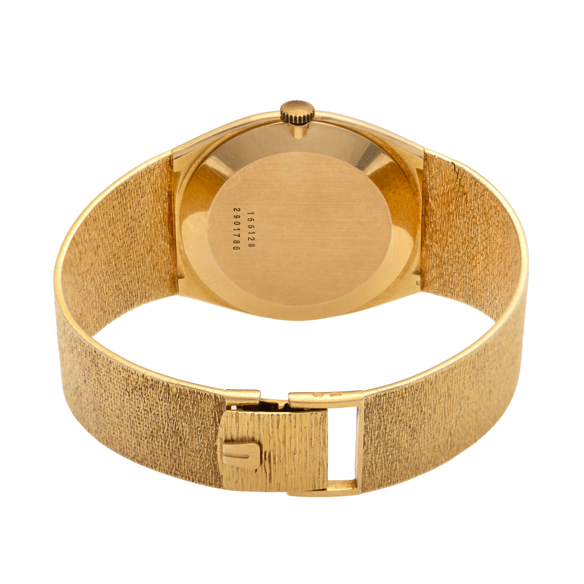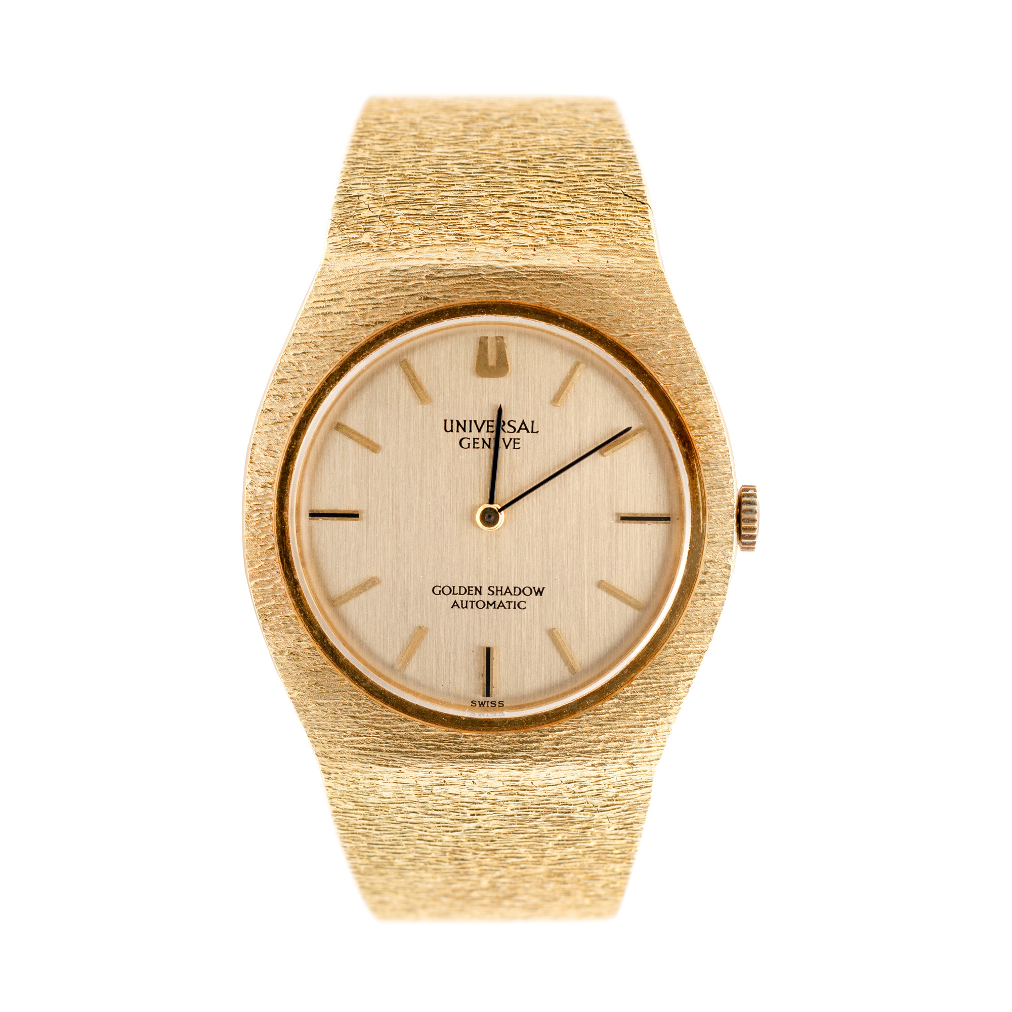 Ceas Universal Geneve Golden Shadow, din aur, de mână, unisex. Mecanism automatic cu microrotor, calibrul 2-66. Cadran de culoare auriu, indici liniari aplicați. Brățară integrată din aur, texturată, cu sistem de închidere cu clemă.