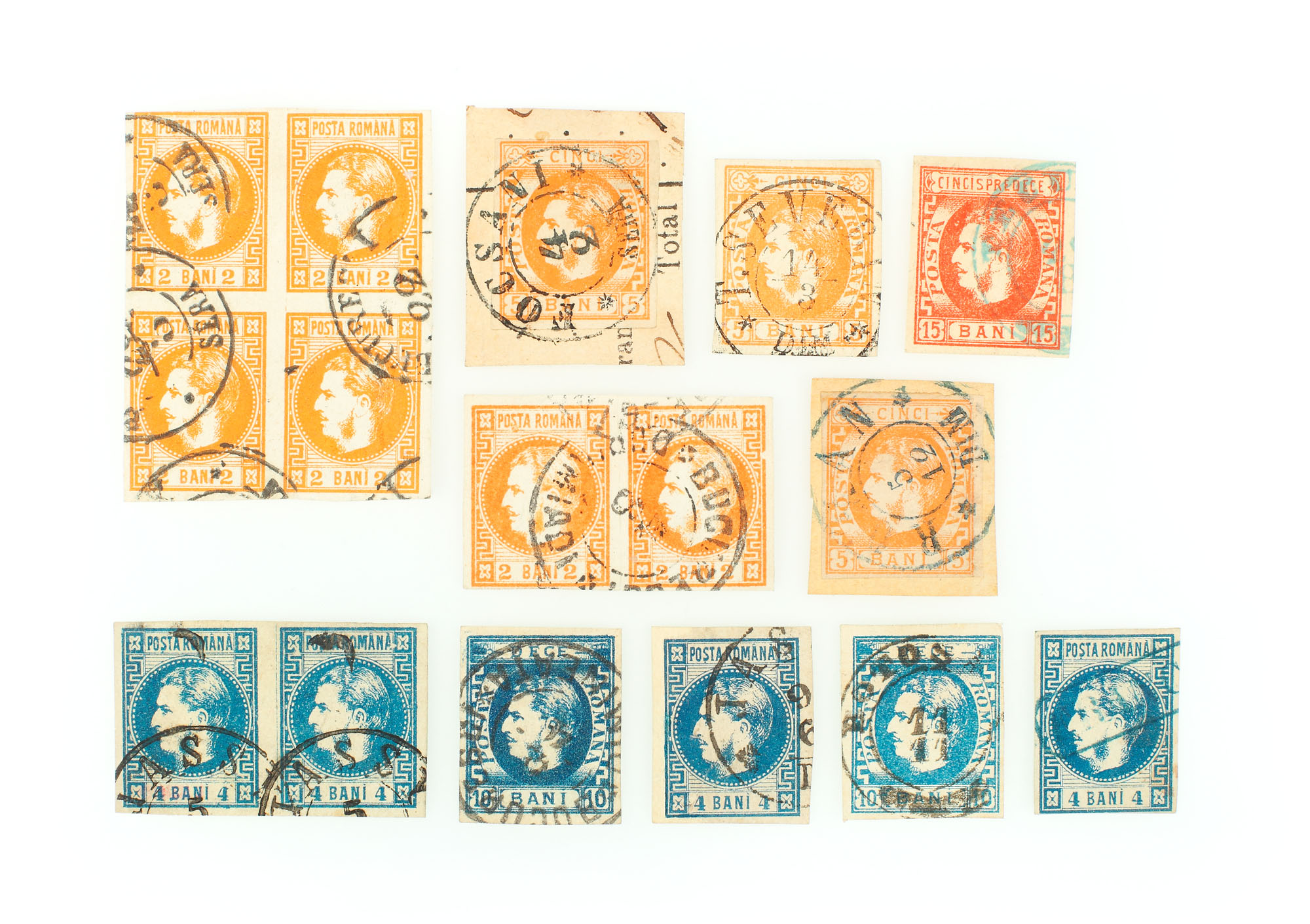 62. Lot format din 16 mărci poştale "Carol cu favoriţi", România, 1868-1869