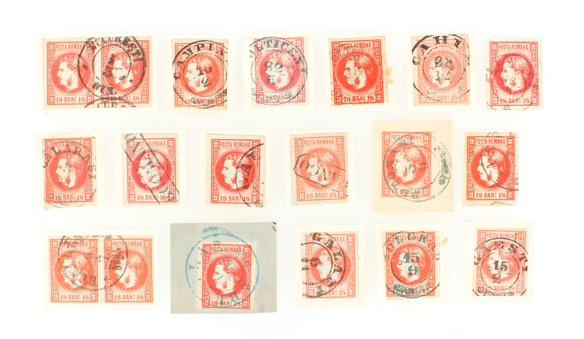 57. Lot format din 19 timbre, "Carol cu favoriţi", de 18 bani fiecare, România, 1868