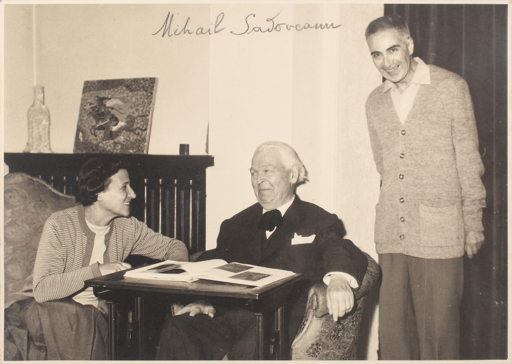 Una dintre ultimele fotografii ale scriitorului Mihail Sadoveanu (1880-1961) realizată în locuința acestuia. Personajul feminin aflat în apropierea scriitorului este Valeria, cea de a doua soție a sa.