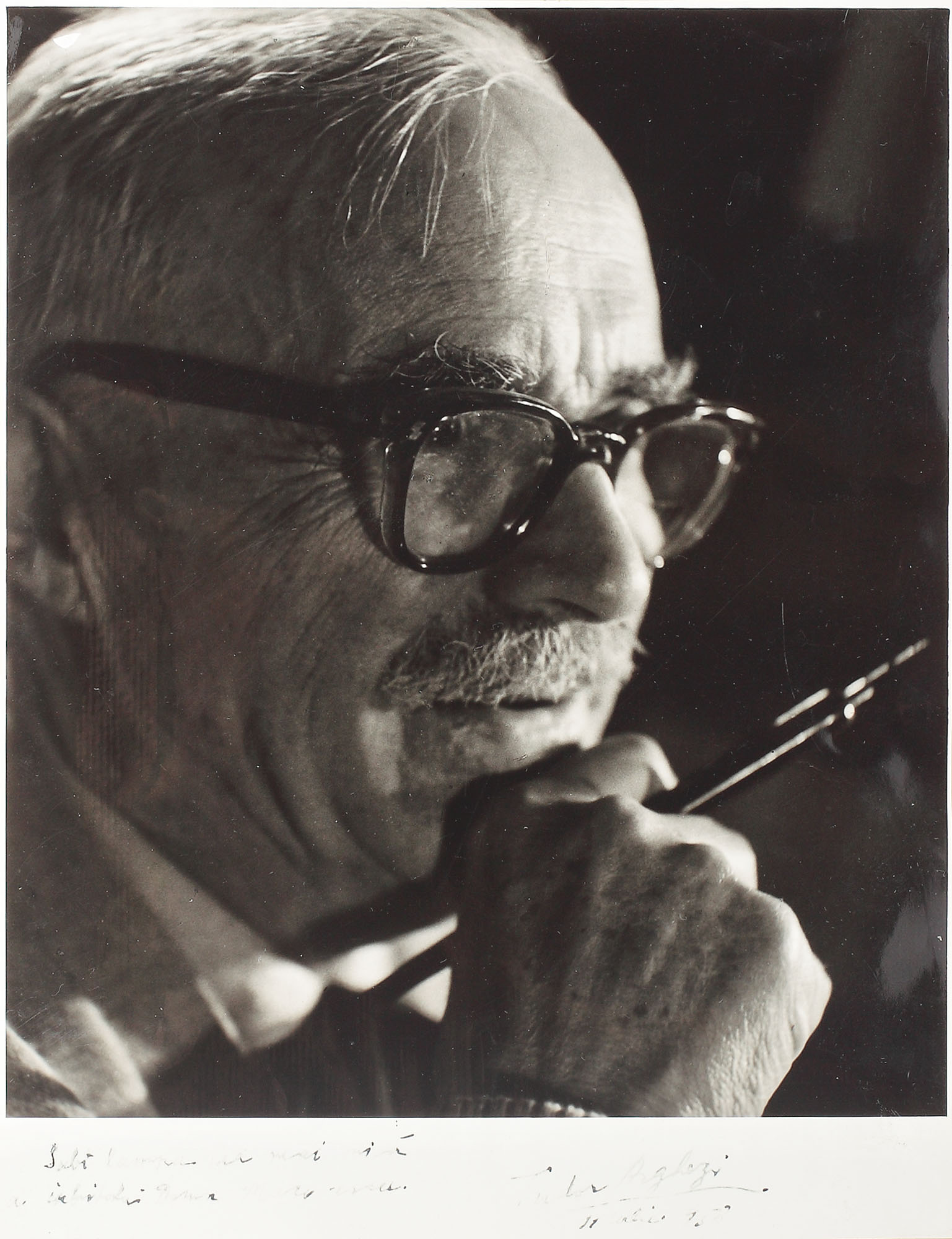 Tudor Arghezi era legat de George Macovescu prin pasiunea scrisului, cei doi se cunoscuseră încă de la sfârșitul anilor '30. Arghezi apare în profil, cu un toc în mână, căzut pe gânduri în căutarea inspirației. În partea de jos a fotografiei se găsește o dedicație olografă a poetului datată 11 iulie 1958 și adresată "iubitului domn Macovescu".