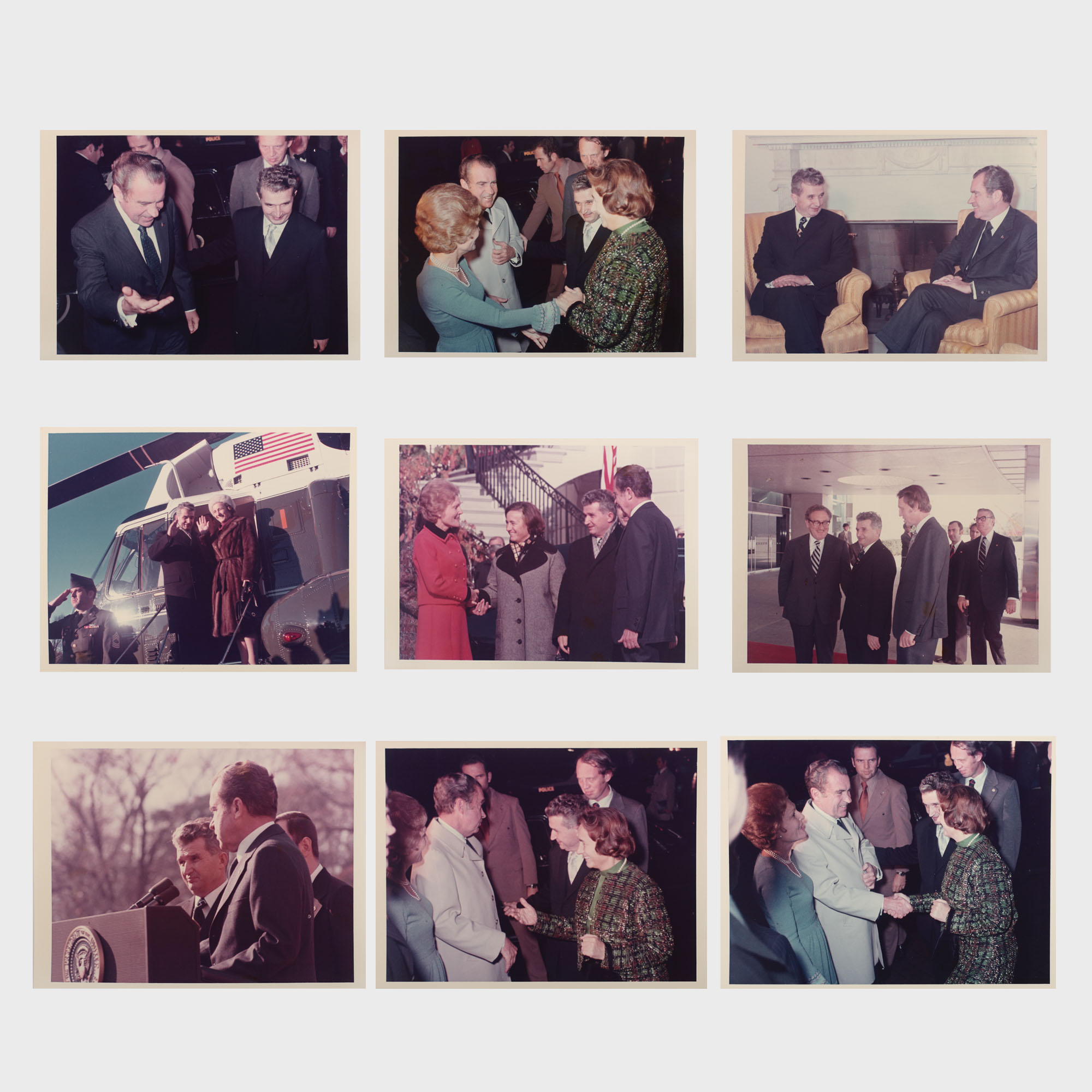 Fotografiile color, excepționale din punct de vedere al execuției tehnice, reprezintă piese de protocol realizate în timpul vizitei oficiale a cuplului Ceaușescu în Statele Unite ale Americii, la invitația președintelui Richard Nixon, în decembrie 1973. Sunt evidențiate întâlnirile bilaterale dintre cei doi lideri la Casa Albă, precum și discuțiile cu Secretarul de Stat Henry Kissinger. Fotografiile fac parte din colecția fostului ministru de externe al României George Macovescu.