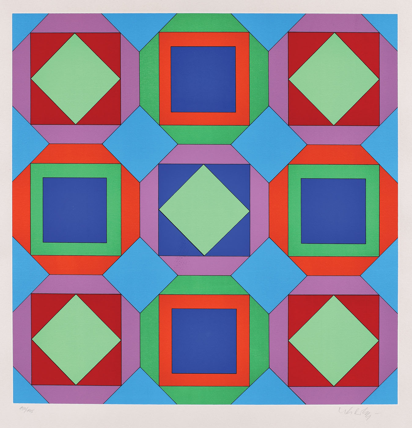 semnat dreapta jos, sub cadru, în creion, "Vasarely"; numerotat stânga jos, sub cadru, în creion, "150/175"
