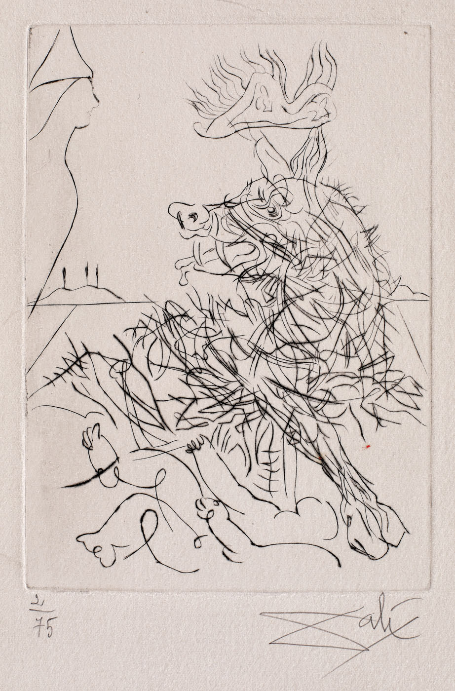 semnat dreapta jos, sub cadru, în creion, "Dali"; numerotat stânga jos, sub cadru, în creion, "2/75"