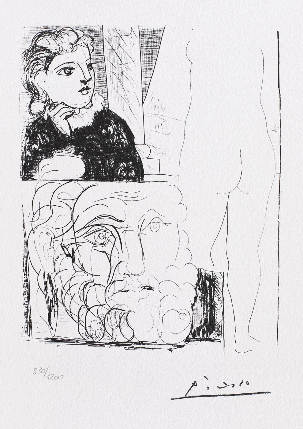 semnat, gravat, dreapta jos, sub cadru, "Picasso"; numerotat stânga jos, sub cadru, în creion, "830/1200"