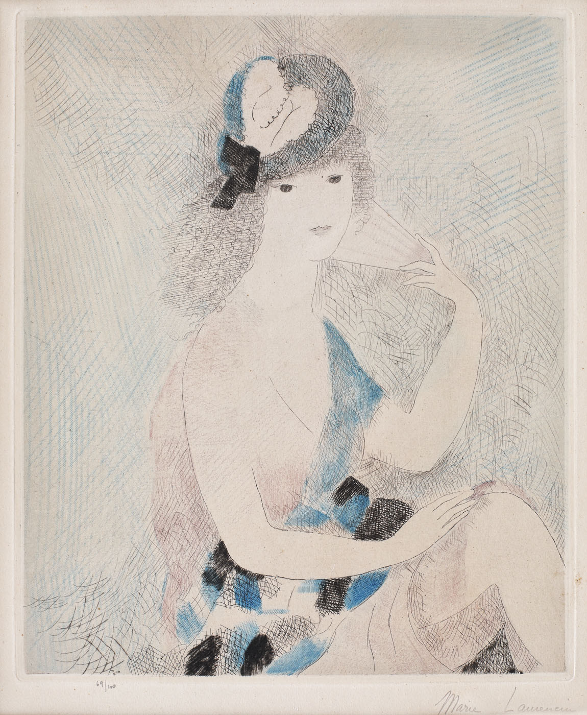 semnat dreapta jos, sub cadru, în creion, "Marie Laurencin"; numerotat stânga jos, sub cadru, în creion, "69/100"
