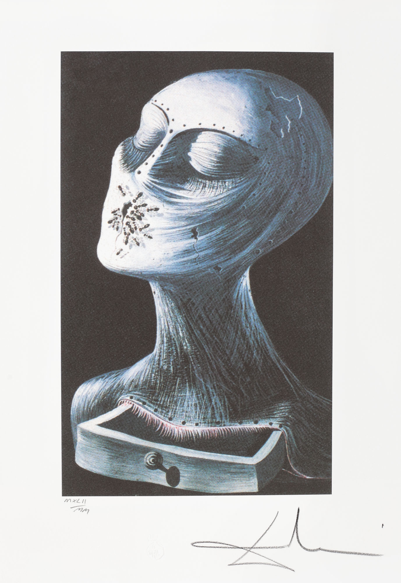 semnat dreapta jos, sub cadru, în creion, ”Dali”; numerotat stânga jos, sub cadru, în creion, ”MXLII/MM”; central jos, ștampila editurii, ”G. Dali”