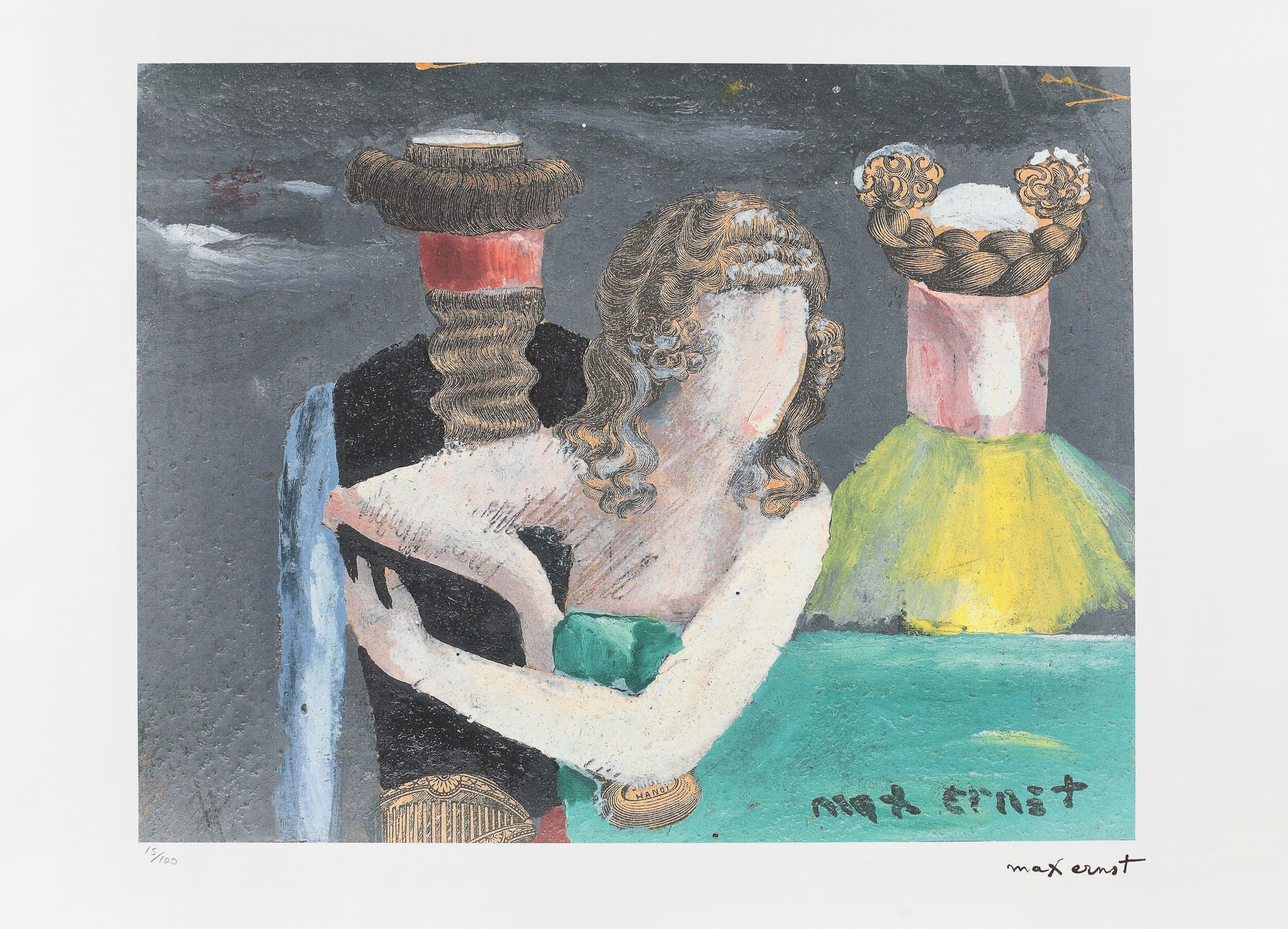 semnat dreapta jos, sub cadru, ”max ernst”; numerotat stânga jos, sub cadru, în creion, ”15/100”; stânga jos, ștampila editurii, ”SPADEM, Paris”